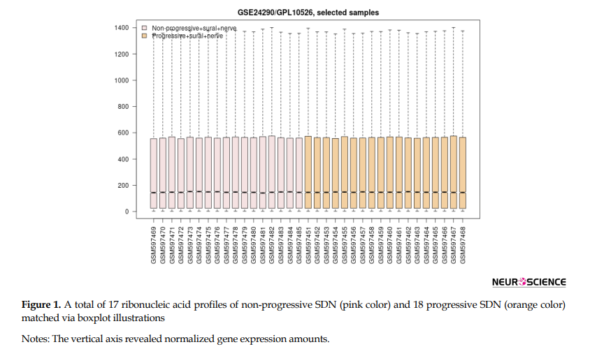 As shown in Figure 1, a total of 17 control samples (non-progressive sural nerve neuropathy) gene expression profiles matched with 18 progressive sural nerve neuropathy samples. There were aligned midpoints, demonstrating that the samples were comparable.
