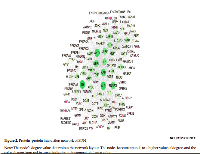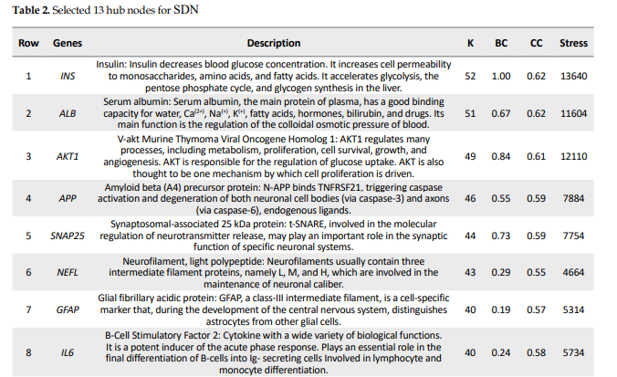 This study represents a critical advancement toward identifying a specific set of genes whose expression levels are closely associated with the onset and progression of SDN. By analyzing gene interactions within known cellular pathways, we could identify common elements in this complicated network to yield novel insights into disease pathogenesis and therapeutic targets to identify potential DN biomarkers. Proteomics is a suitable screening tool for extracting a large amount of data to identify biomarkers related to PDN. A proteomic research, for example, suggested serum apolipoprotein C1 precursor for detecting and classification of DN (Tang et al., 2011). Our initial analysis of data sets classified as progression of DN. The reported data related to DN were screened by PPI network analysis to trace key related elements. The samples, including progressive and non-progressive DN, were matched as equal boxplots demonstrated in Figure 1 and statistically comparable. A total of 26 significant genes were selected considering restricted conditions for further investigations (Table 1). As shown in Table 1, the two overexpressed genes were GJB6 and CCL26, respectively. The GJB6 gene, or gap junction protein beta 6, as the highest over-expressed gene (Log FC=1.4), provides instructions for making a protein named gap junction beta 6 or connexin 30. Its related pathways are gap junction trafficking and vesicle-mediated transport (Nahili et al., 2008). GJB6 upregulation in progressive DN is associated with fatty acid homeostasis and glucose homeostasis, which is confirmed by our results (Zhou & Zhang, 2019). GJB3 is an important paralog of this gene and is expressed in peripheral and auditory nerves, which could cause peripheral nerve neuropathy and auditory impairment (López-Bigas et al., 2001). The second overexpressed one was CCL26 or C-C motif chemokine ligand 26, which is a protein-coding gene involved in PEDF-induced signaling and AKD signaling. Gene ontology related to this gene has chemokine activity, and an important paralog of this gene is CCL2, which enhances microglial activation, leading to increased expression of receptor CCR2, suggesting an important role of chemokine CCL2 and its receptor CCR2 in the development of neuropathic pain (Kwiatkowski & Mika, 2014). On the other hand, two lower-expressed genes were GYS2 and PFKFB1, respectively. GYS2 is involved in glucose metabolism, and its expression is decreased in diabetic patients, which conforms to our findings (Nilsson et al., 2014). The GYS2 gene provides instructions for making liver glycogen synthase, an enzyme produced in the liver to form glycogen from glucose monomers. GYS2 plays a role in the denosine monophosphate (AMP)-activated protein kinase (AMPK) signaling pathway in PDN (Zhou & Zhang, 2019). PFKFB1 (6-phosphofructo-2-kinase/fructose-2,6-bisphosphatase 1) is a protein-coding gene, and one of its related pathways is glucose metabolism. Signaling pathway of AMPK in progressive and non-progressive DN is significantly enriched with PFKFB1 and other genes as PPARG and SDC. Network analysis suggested AMPK and PPAR pathways may be implicated in DN, confirmed by our results (Li et al., 2016). Table 2 demonstrates the identified hubs that are ranked and tabulated based on degree value. Myelin formation is the result of the circumferential wrapping of Schwann cells’ cytoplasm, and it is particularly enriched with cholesterol and saturated long-chain fatty acids (Saher et al., 2011). Some researchers believed that diabetic hyperglycemia leads to malfunction in differentiation and re-differentiation of Schwann cells in accompany with myelin damage (Sango et al., 2011). New myelin formation after Schwann cells malfunction could be difficult and may cause DN progression (Cinci et al., 2015). As it is depicted in Table 2, a total of 13 nodes of the constructed network were highlighted as hub genes. Among the hub nodes (INS, ALB, AKT1, APP, Snap25, NEFL, GFAP, IL6, NEFM, TNF, MAPT, GAP43, and MBP), there are 11 first neighbors. According to the assumptions in Table 2, there are two queried hubs among the introduced hubs, including NEFL and NEFM.