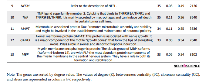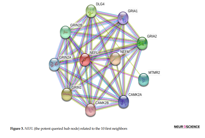 Among the 13 hubs, only 2 nodes are queried genes named NEFL and NEFM. The first 10 neighbors of NEFL (as the potent queried hub nodes) as an interactome are shown in Figure 3.