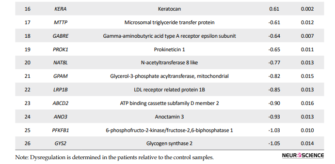 The network, including 26 DEGs plus 100 first neighbors, was constructed. The analyzed network based on degree value is shown in Figure 2.