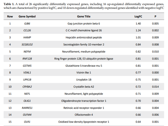 Among 250 top-score genes, 26 genes (FC ≥1.5 and P<0.05) were identified as significant DEGs (Table 1).