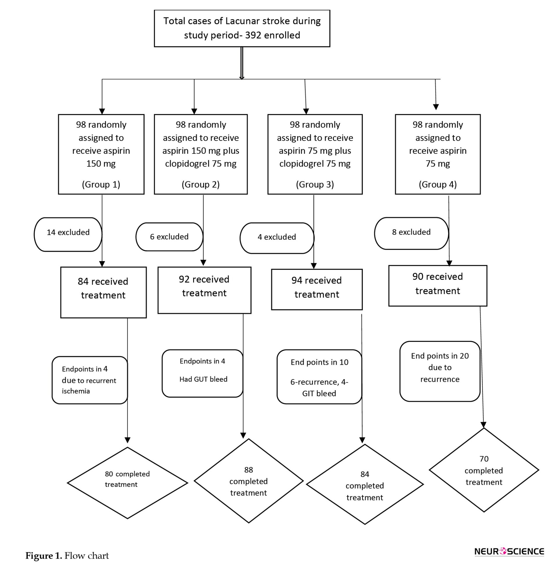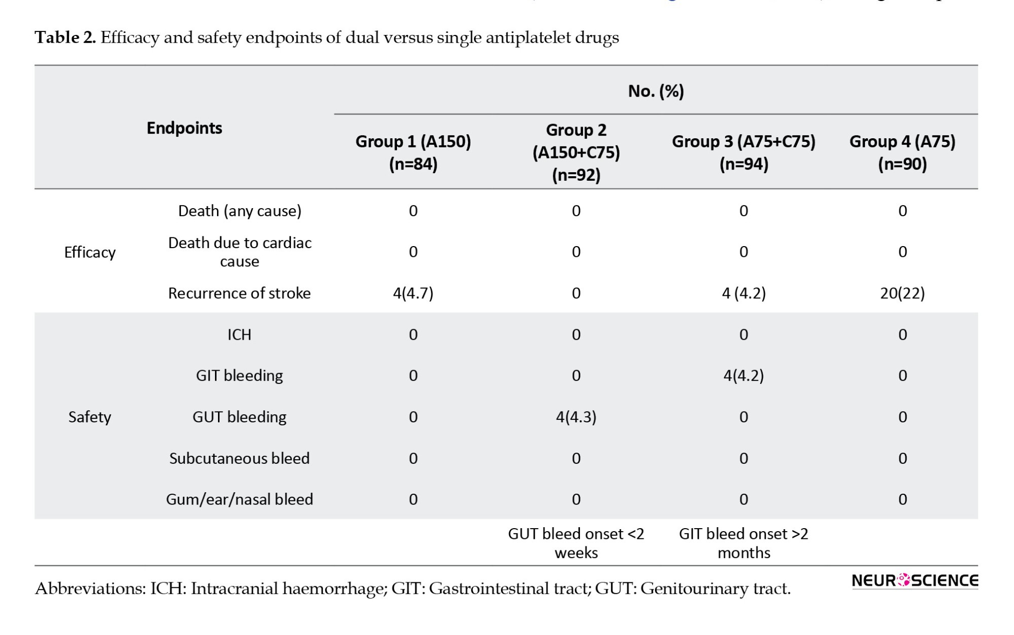 Our focus was largely on the main endpoints. Endpoints were the recurrence of stroke, cardiovascular death, and bleeding events. The efficacy of the drug was determined by clinical improvement or any recurrence at follow-up. Intracranial and extracranial bleeding tendencies, and the tolerability of the drug, determined the safety of the drug.
