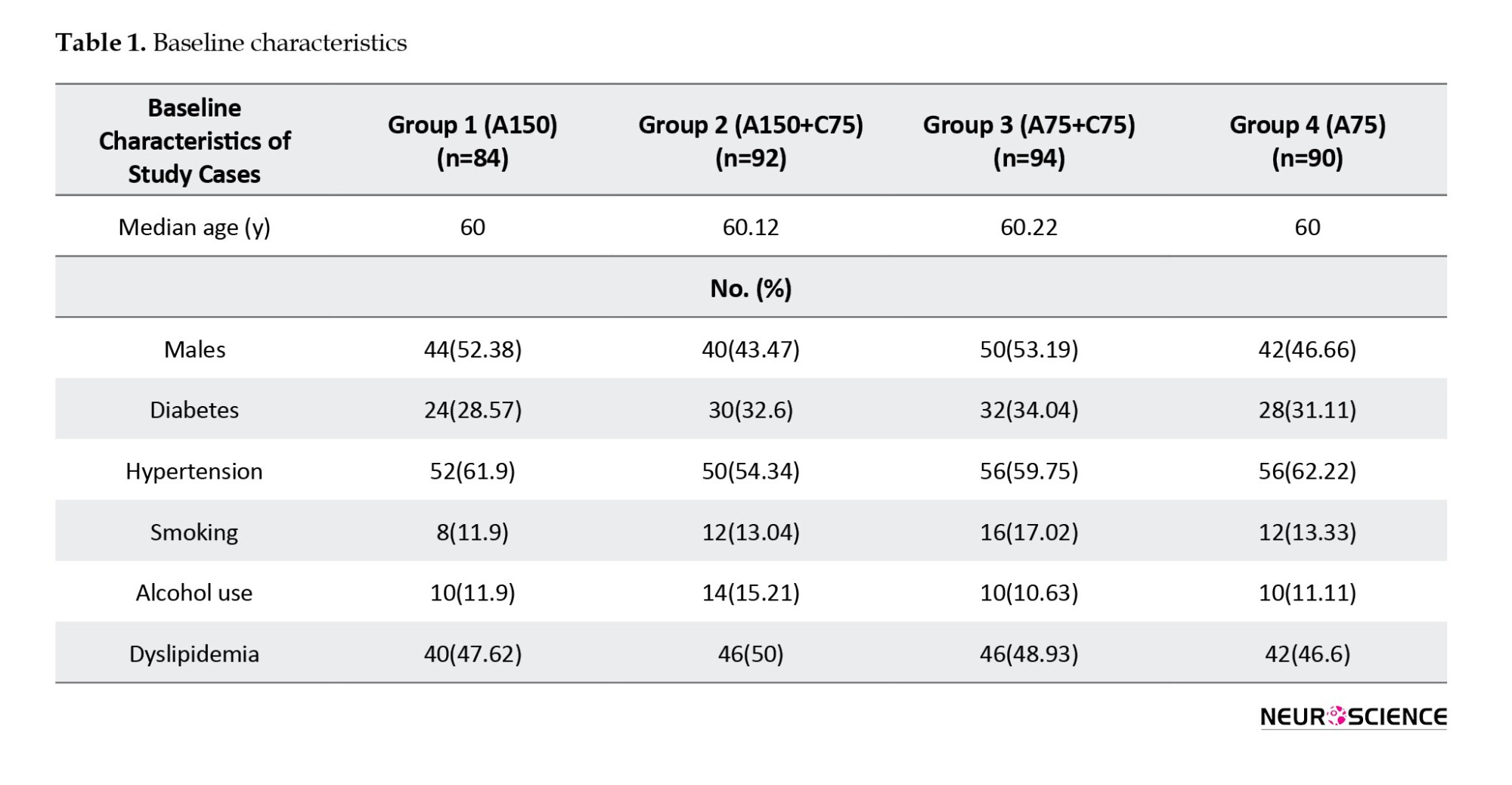 Of the 392 patients diagnosed with lacunar stroke, 360 were included in the study (Figure 1) and were followed for 90 days. Participants were randomly assigned to 4 groups. A total of 84 patients received aspirin 150 mg (group 1: A150) alone, 92 patients received aspirin 150 mg plus clopidogrel 75 mg (group 2: A150+C75), 94 patients received aspirin 75 mg plus clopidogrel 75 mg (group 3: A75+C75), and the remaining 90 patients were treated with aspirin 75 mg alone (group 4: A75).