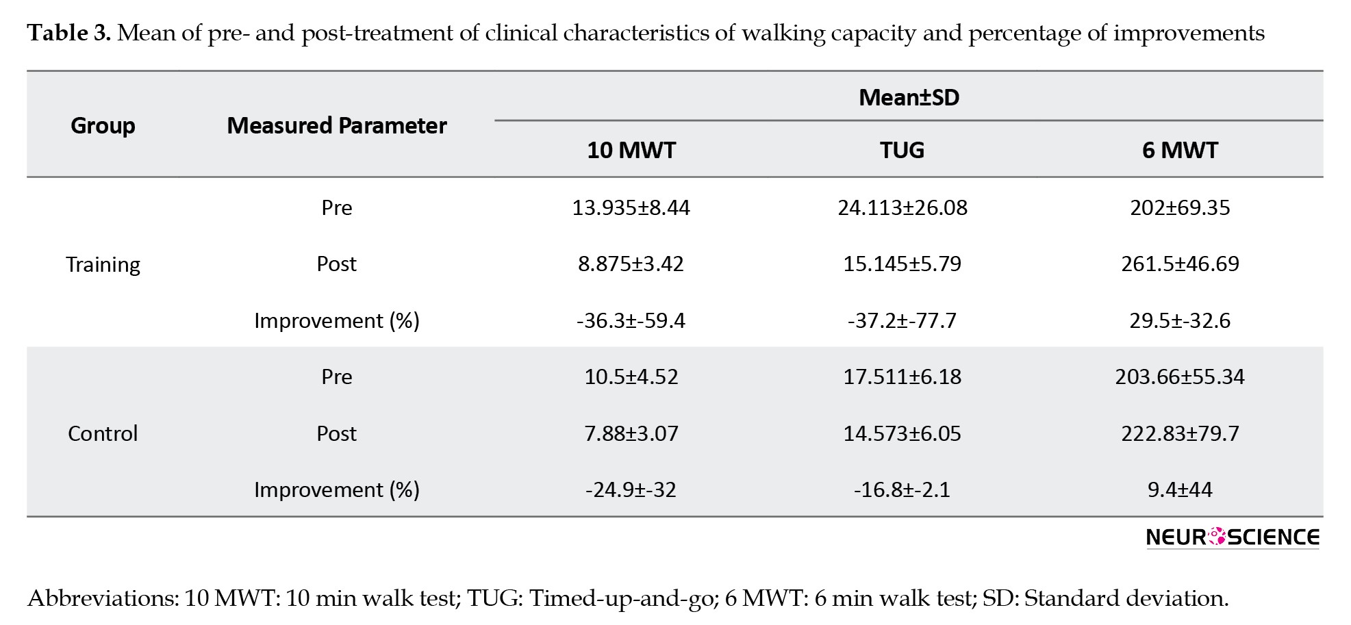 Table 3 summarizes the average group results of the clinical measures of walking capacity and the percentage of changes after the administration of the 8-week training course for both the study and control groups.