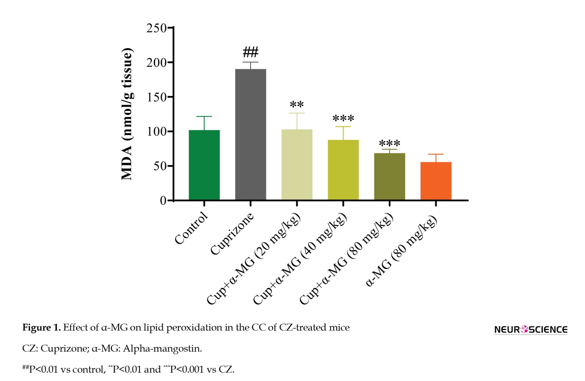 To our knowledge, this is the first study to investigate the effects of α-MG in a mouse model of CZ-induced MS. Our findings demonstrate that feeding mice a diet containing 0.4% (w/w) CZ led to pronounced neurotoxicity, characterized by reduced body weight and elevated oxidative stress, apoptosis, and inflammation in the CC. Oral administration of α-MG at doses of 20, 40, and 80 mg/kg over five weeks effectively prevented body weight loss and mitigated oxidative stress, apoptotic activity, and inflammatory responses in CZ-exposed mice.