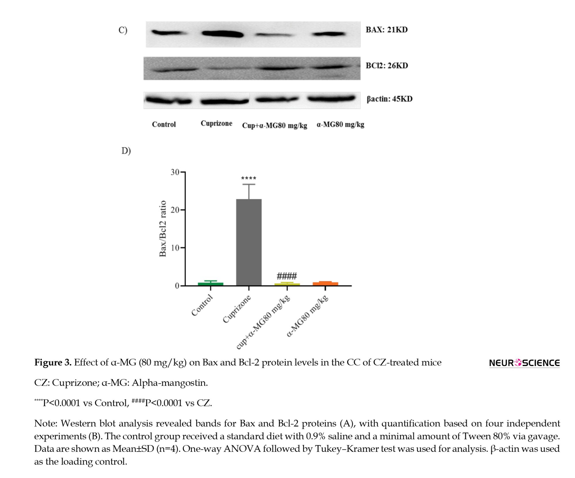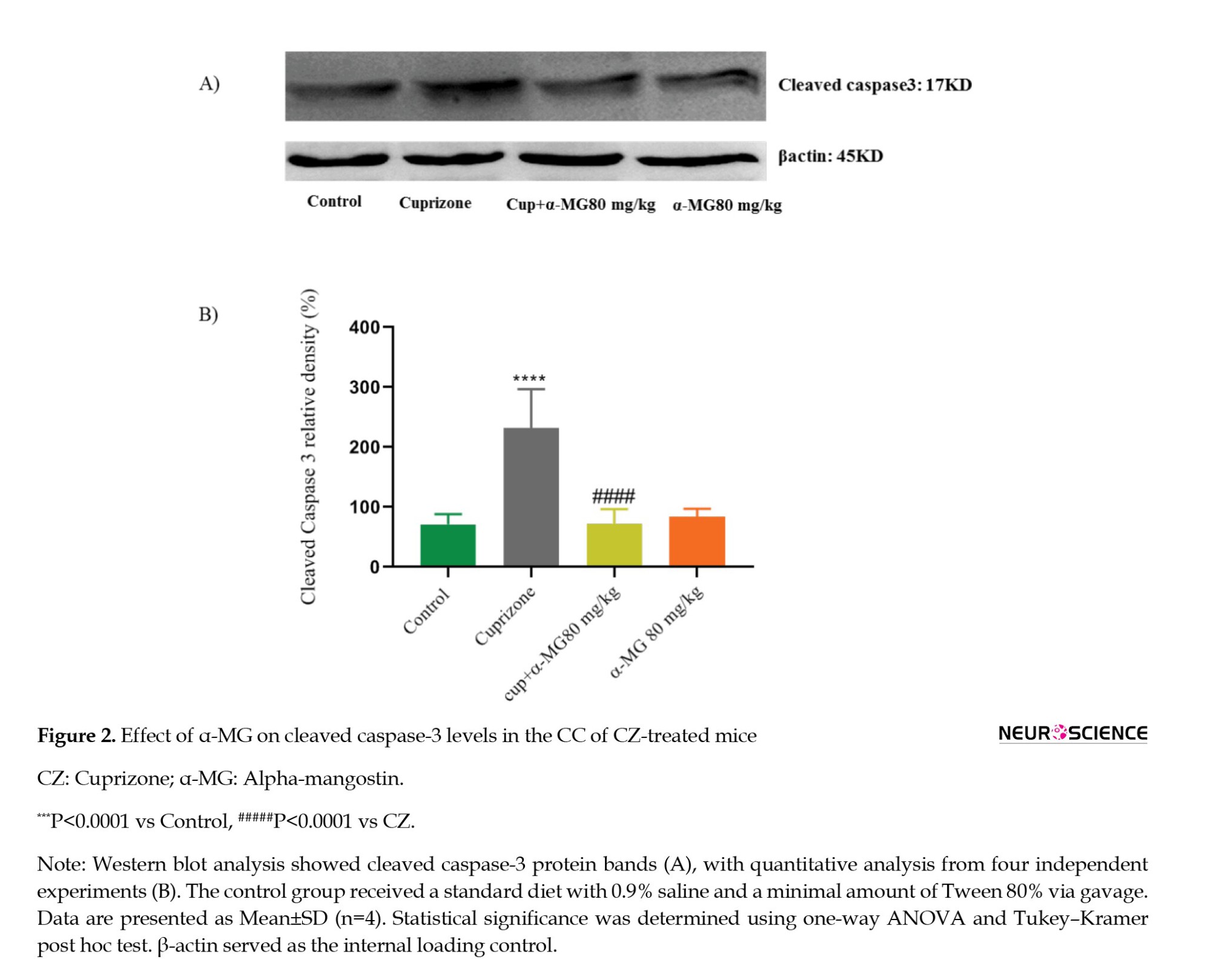 Consistent with these reports, our study demonstrated that administration of α-MG at 80 mg/kg significantly reduced both cleaved caspase-3 levels and the Bax/Bcl-2 ratio in the CC of CZ-treated mice, indicating a marked anti-apoptotic effect.