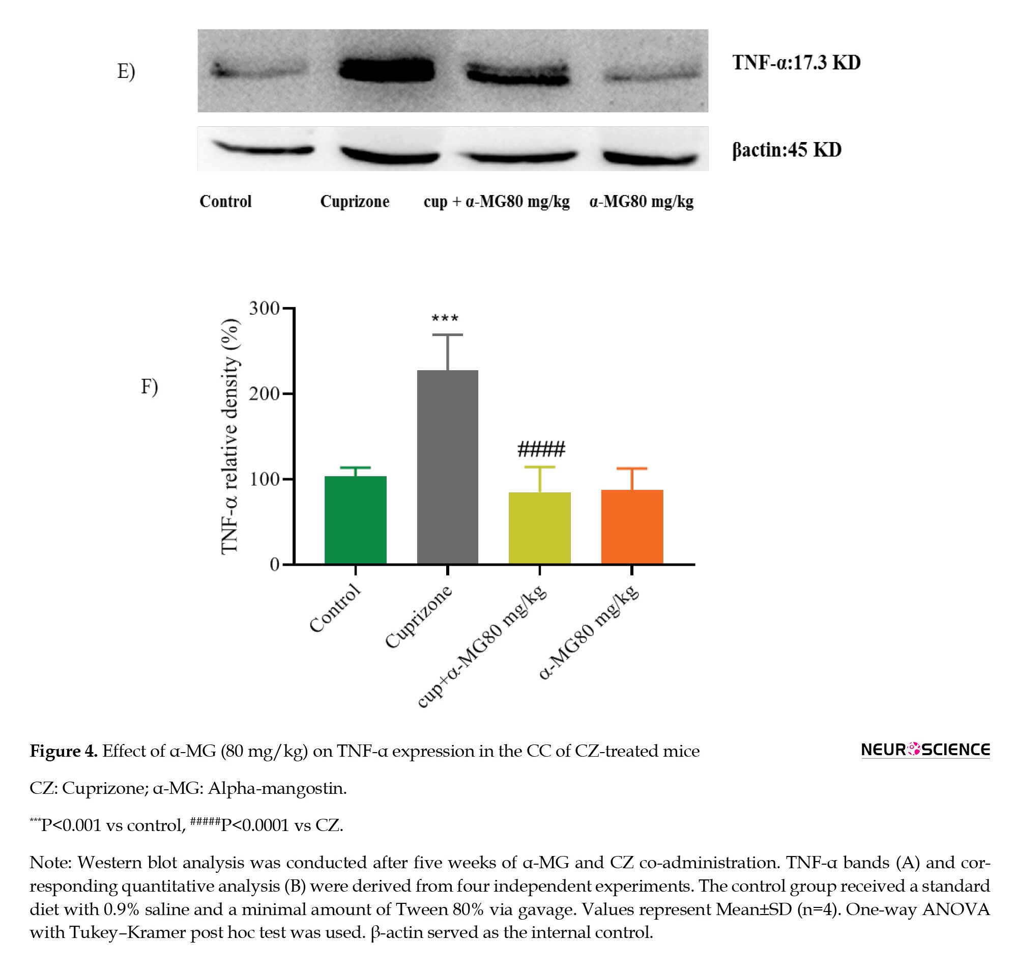 Demyelination induced by CZ was associated with a significant increase in the expression of the pro-inflammatory cytokine tumor necrosis factor-alpha (TNF-α) (P<0.001). Treatment with α-MG (80 mg/kg) for five weeks significantly reduced TNF-α levels compared to the CZ group (P<0.0001), indicating a pronounced anti-inflammatory effect (Figures 4A and 4B).