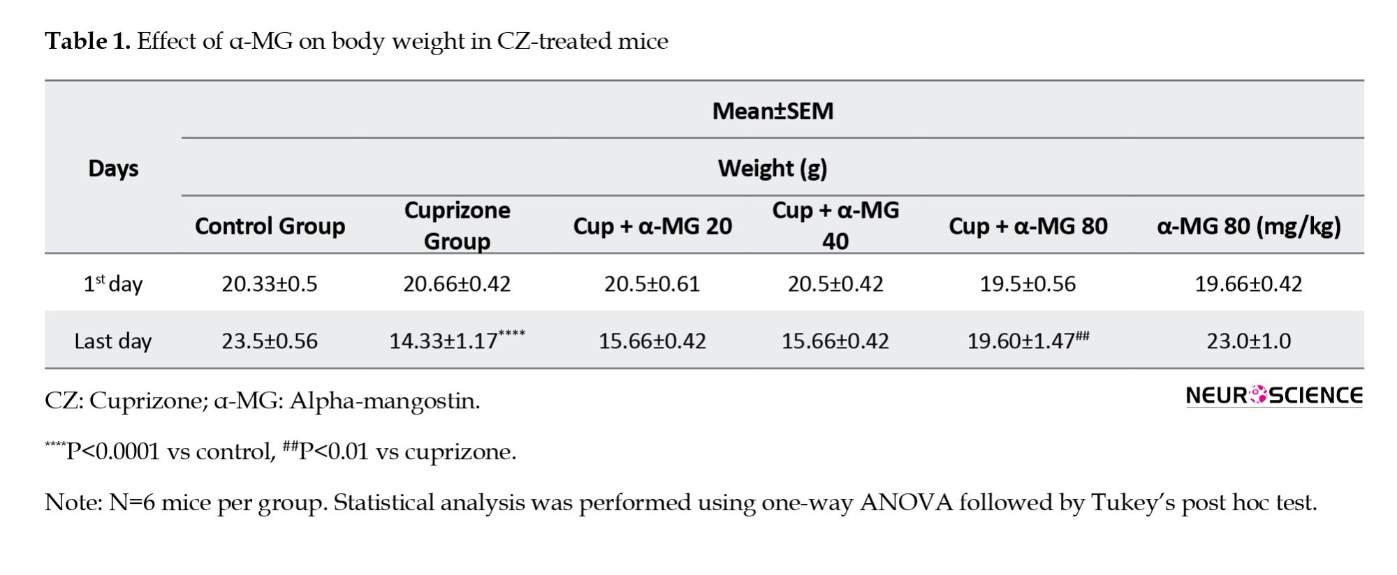 In light of these findings, the present study aimed to evaluate the efficacy of α-MG in mitigating clinical symptoms, inflammation, and oxidative stress in a CZ-induced demyelination model of MS using C57BL/6 mice over a 5-week experimental period. To our knowledge, this is the first investigation into the neuroprotective potential of α-MG within this context, including an exploration of the underlying molecular mechanisms.