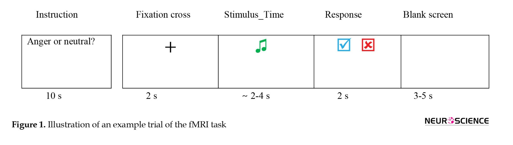 The instruction was displayed for 10 s before every block. A fixation cross was shown after a 5-7 s blank screen. After that, an audio stimulus was played to address anger/neutral discrimination. The duration of each stimulus was between about 2 and 4 seconds. The time required to respond was 2 seconds.