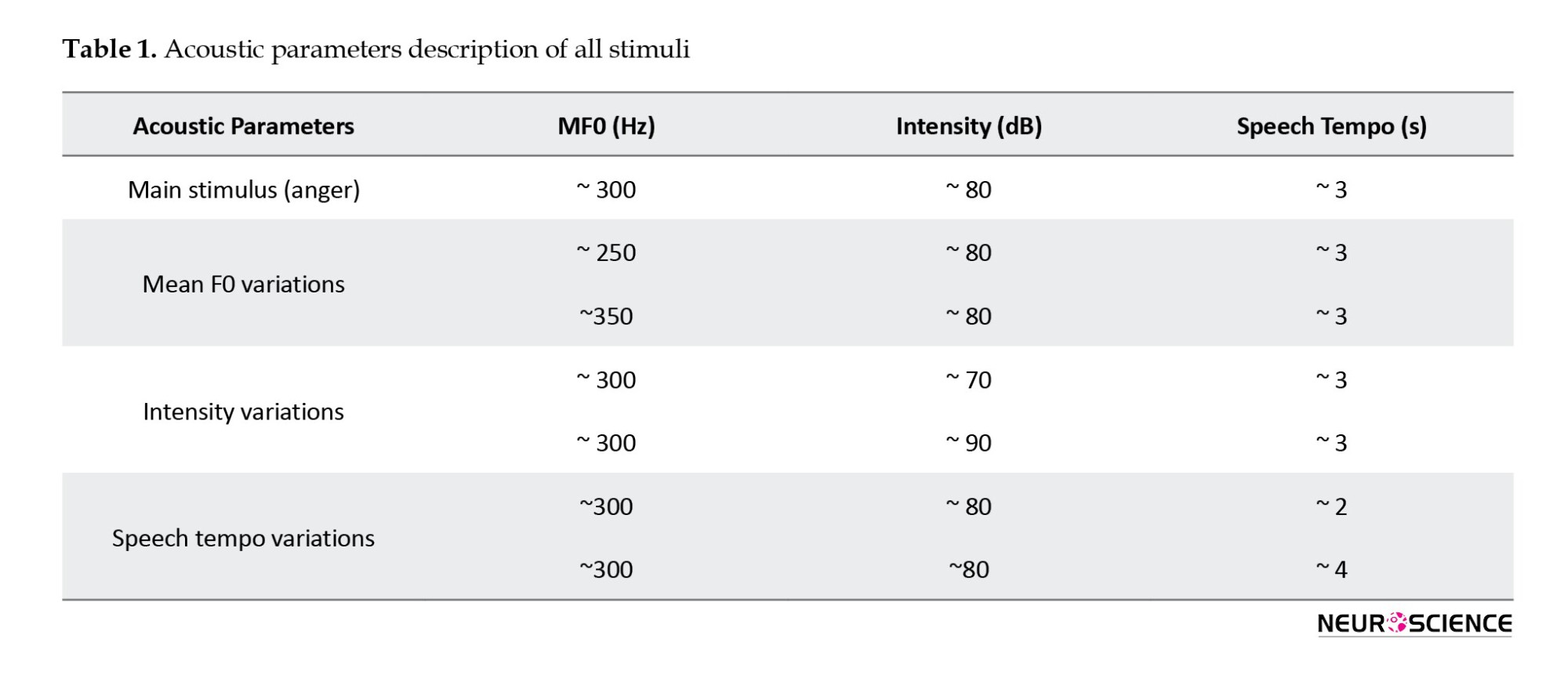 Three pseudo-words (“čârs,” “mâruk,” and “nirâpat”) were selected from a Persian language study (Kazemi & Saeednia, 2017) that was administered a Persian non-word repetition (NWR) test. A male speech and language pathologist spoke these pseudo-words in neutral or angry tones. After that, the three pseudo-words were used consecutively as one stimulus. Then, the acoustic parameters (mean F0, intensity, and speech tempo) of the anger stimulus were changed using Audacity software, version 2.1.0. Every time, one of the parameters was changed while keeping the other two constant. In detail, the mean F0 was changed between 200 and 400 Hz while keeping the other two parameters constant. Once again, keeping the mean F0 and tempo constant changed the mean intensity between 50 and 90 dB. Finally, the speech tempo was changed between 1 to 5 seconds without changing the mean F0 and intensity. After applying the changes to judge whether they were angry, they were piloted on a group of healthy adults (n=10) before the fMRI study. These healthy individuals were selected among the Iran University of Medical Sciences students. Finally, two changes were chosen in each acoustic parameter’s highest and lowest range of anger. The highest and lowest mean F0 detectable as anger prosody was about 350 and 250 Hz, respectively. The highest and lowest rate of change in speech tempo that could be recognized as anger prosody was about 4.2 and 2.1 seconds, respectively. The fMRI’s highest and lowest audible intensity were about 90 and 70 dBs, respectively. Therefore, 6 new changes (two changes in each parameter) were administrated (Table 1).