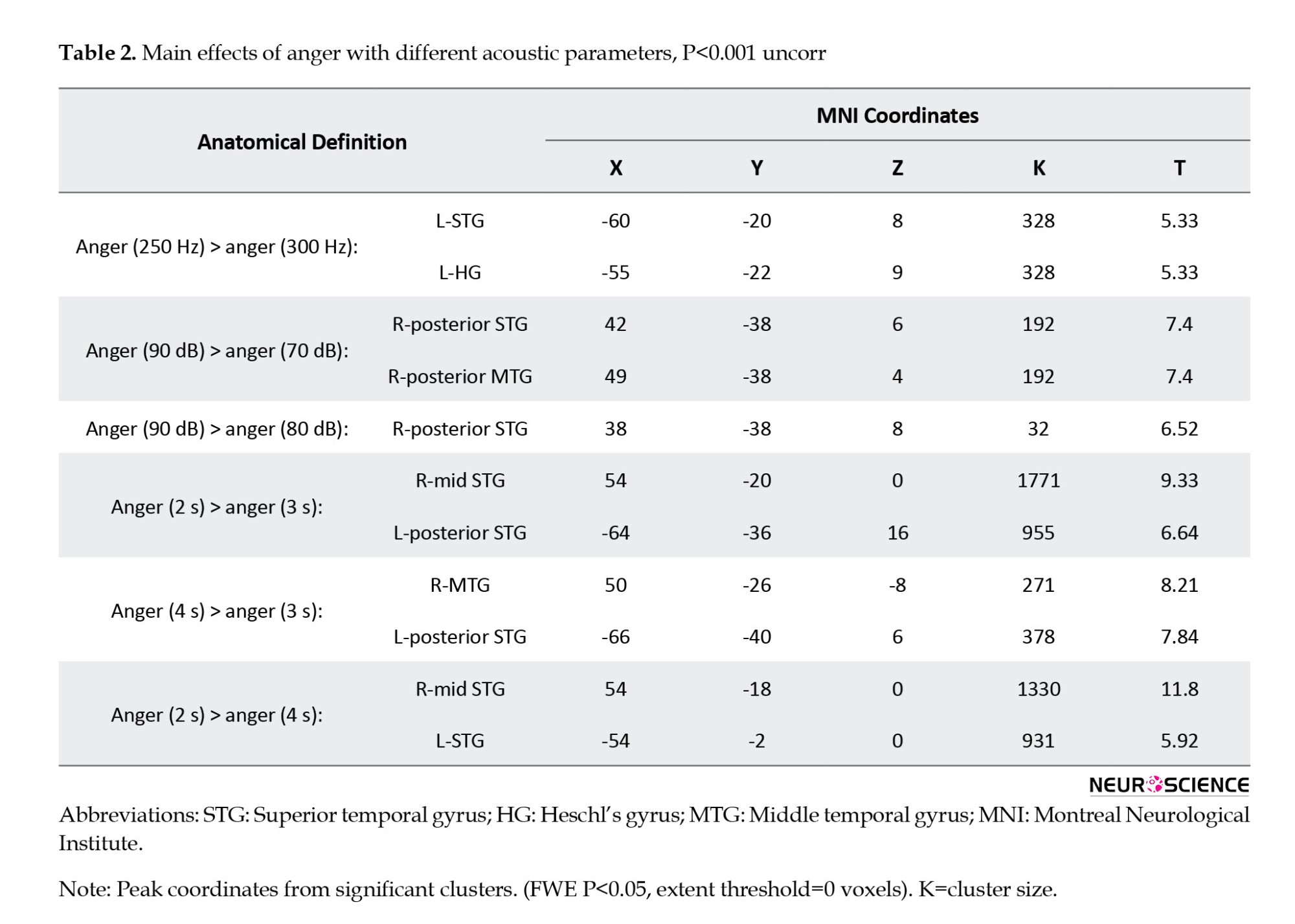 As discussed in the introduction, AC and mid-STC (Bach et al., 2008; Brück et al., 2011; Ethofer et al., 2006) have a role in the extraction of acoustic parameters and different parts of STG and MTG of both hemispheres in our findings in decoding the anger acoustic parameters. So, we can conclude that more intense anger following the lower fundamental frequency, increased intensity, and faster speech tempo leads to increased activity in the specific brain regions related to decoding the anger acoustic parameters. Eventually, different information is sent to IFG and OFC (Schirmer & Kotz, 2006; Witteman et al., 2012) for more intense comprehension of anger.