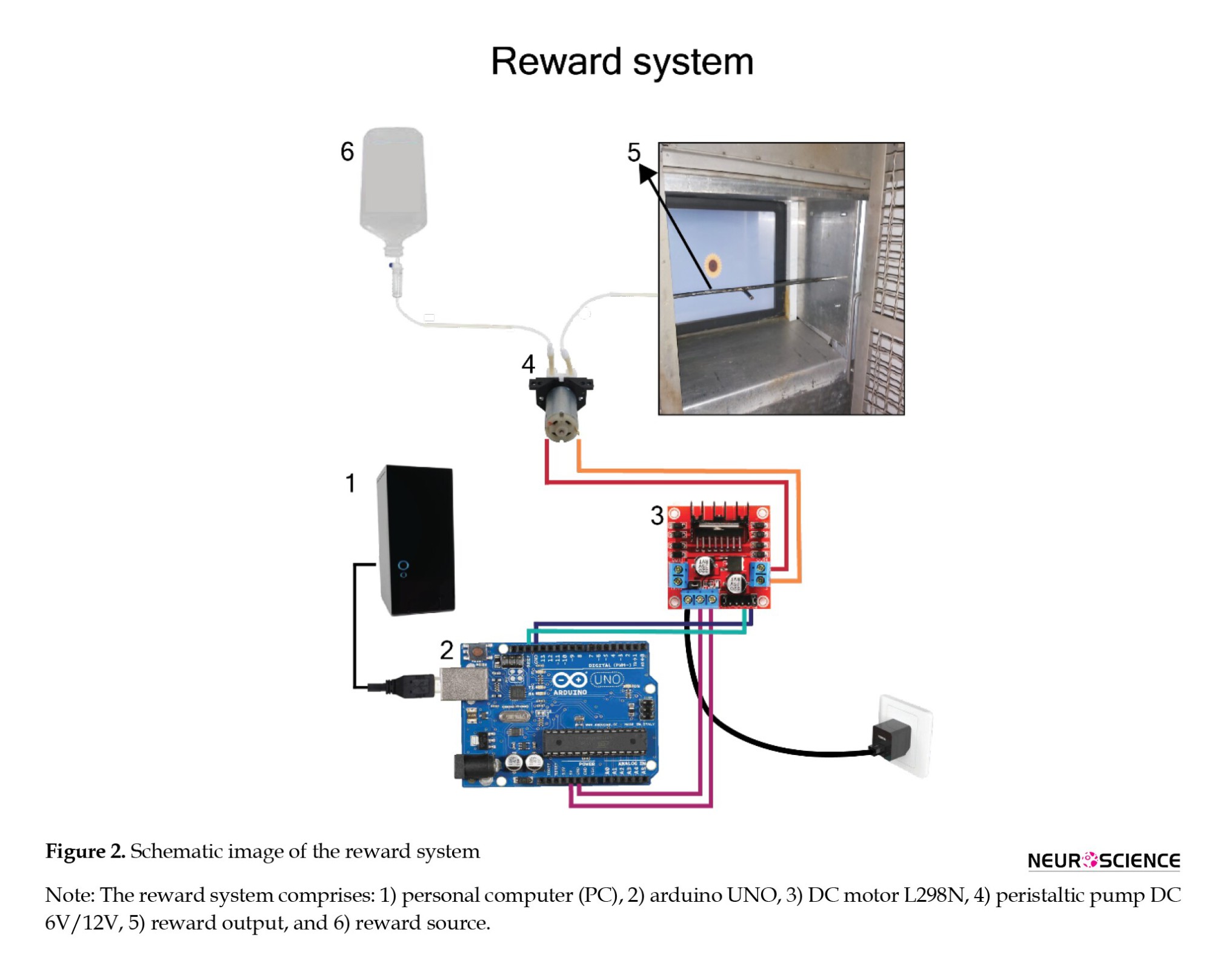 The reward system consists of a DC motor L298N, an Arduino UNO, and a peristaltic pump (Figure 2). Arduino is an open-source hardware and processing platform for programming. The Arduino hardware is programmed using a wiring-based language within a processing-based environment, equipped with all necessary libraries. The Arduino UNO, based on the ATmega328 microcontroller, features 14 digital I/O pins, one USB port, and one power jack supporting 7 to 12 volts.
