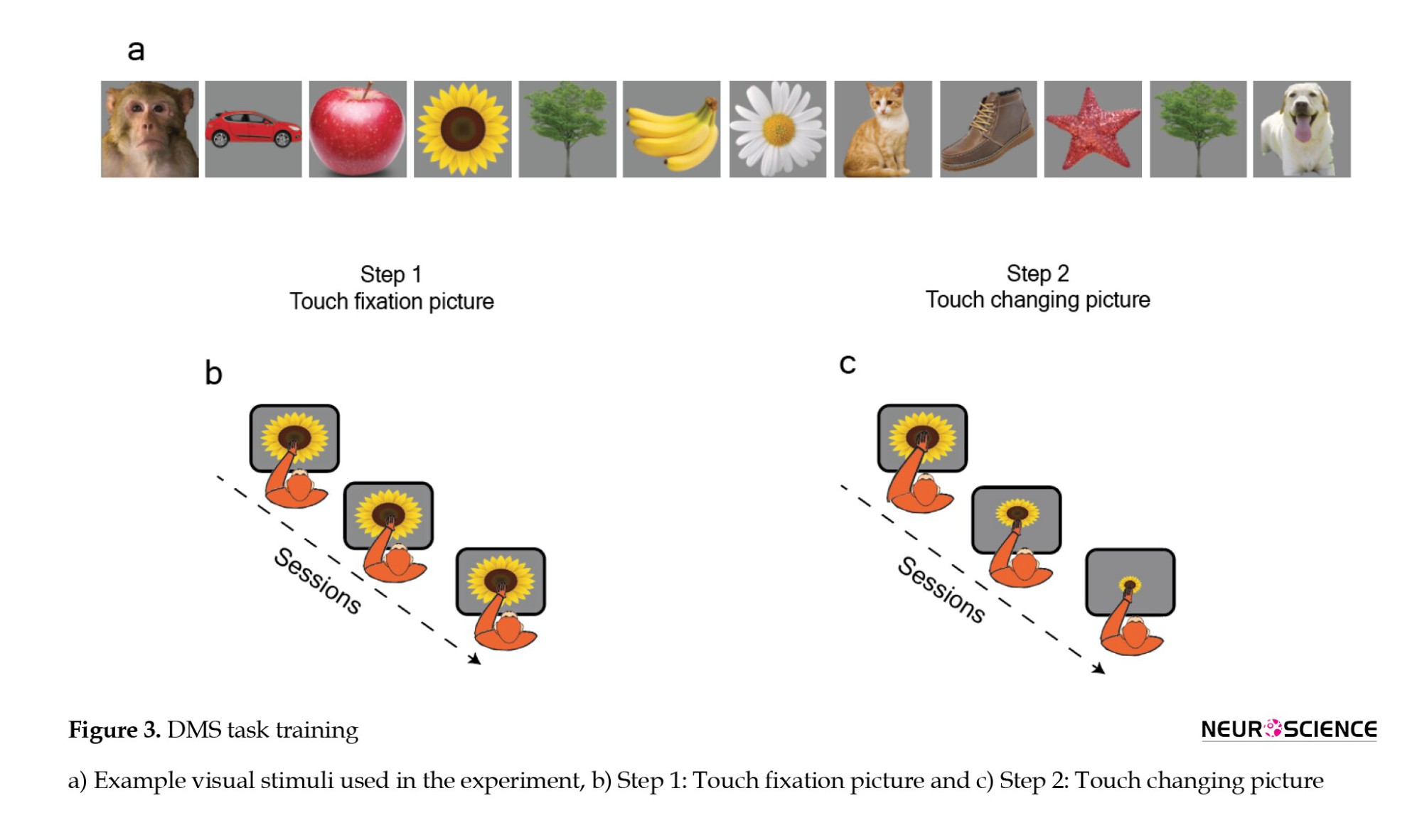 In the fourth training step, our objective was to introduce and teach the DMS task. Initially, a sample image was displayed at the center of the screen, and the animal received a reward for touching the image (sample presentation). Subsequently, a blank screen was presented to the animal for 1000 ms (delay period), after which the same image randomly appeared on either the right or left side of the screen (choice phase). If the animal successfully touched the image, it received a reward (correct response); otherwise, it moved on to the next trial (Figure 5a).