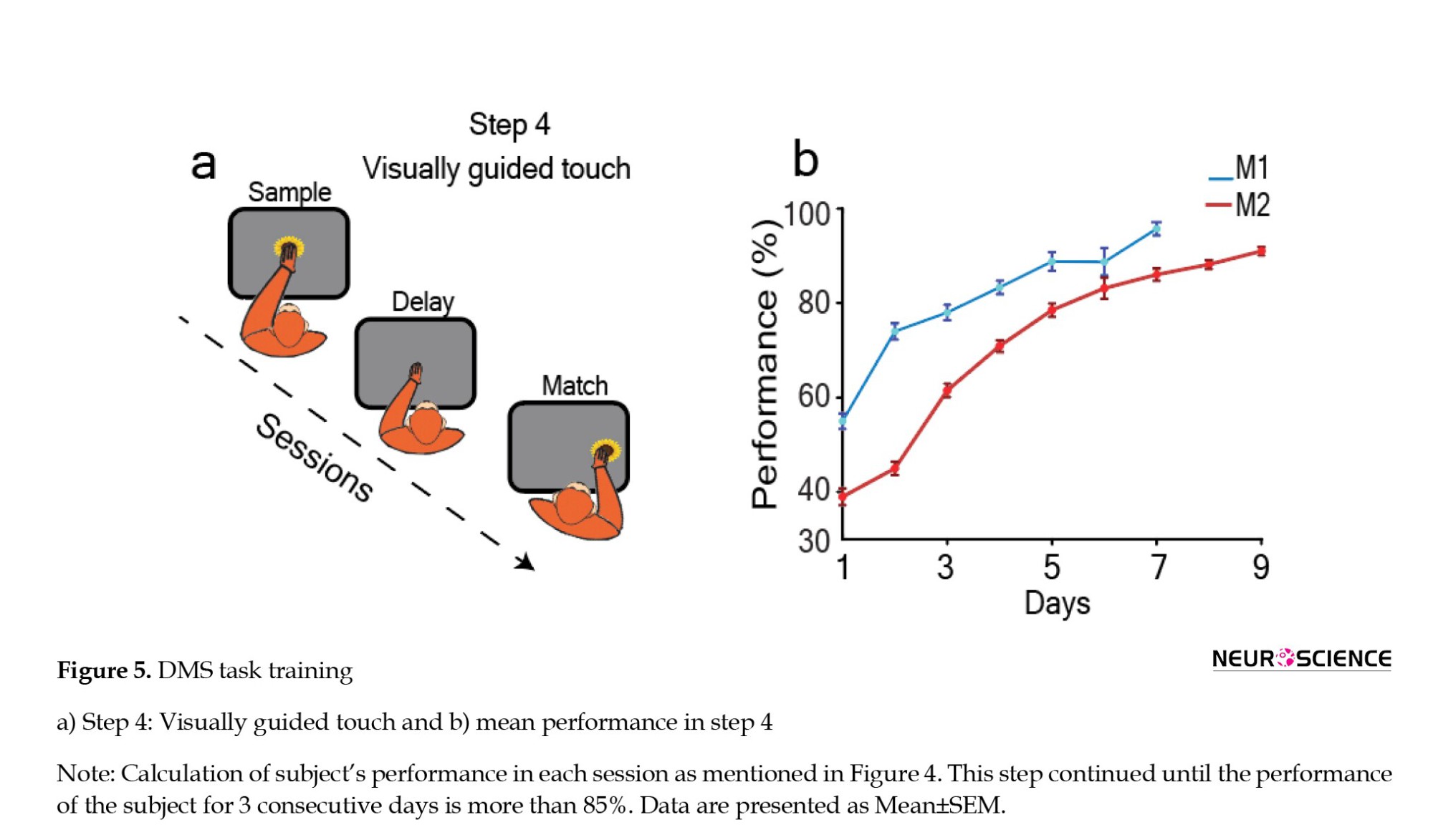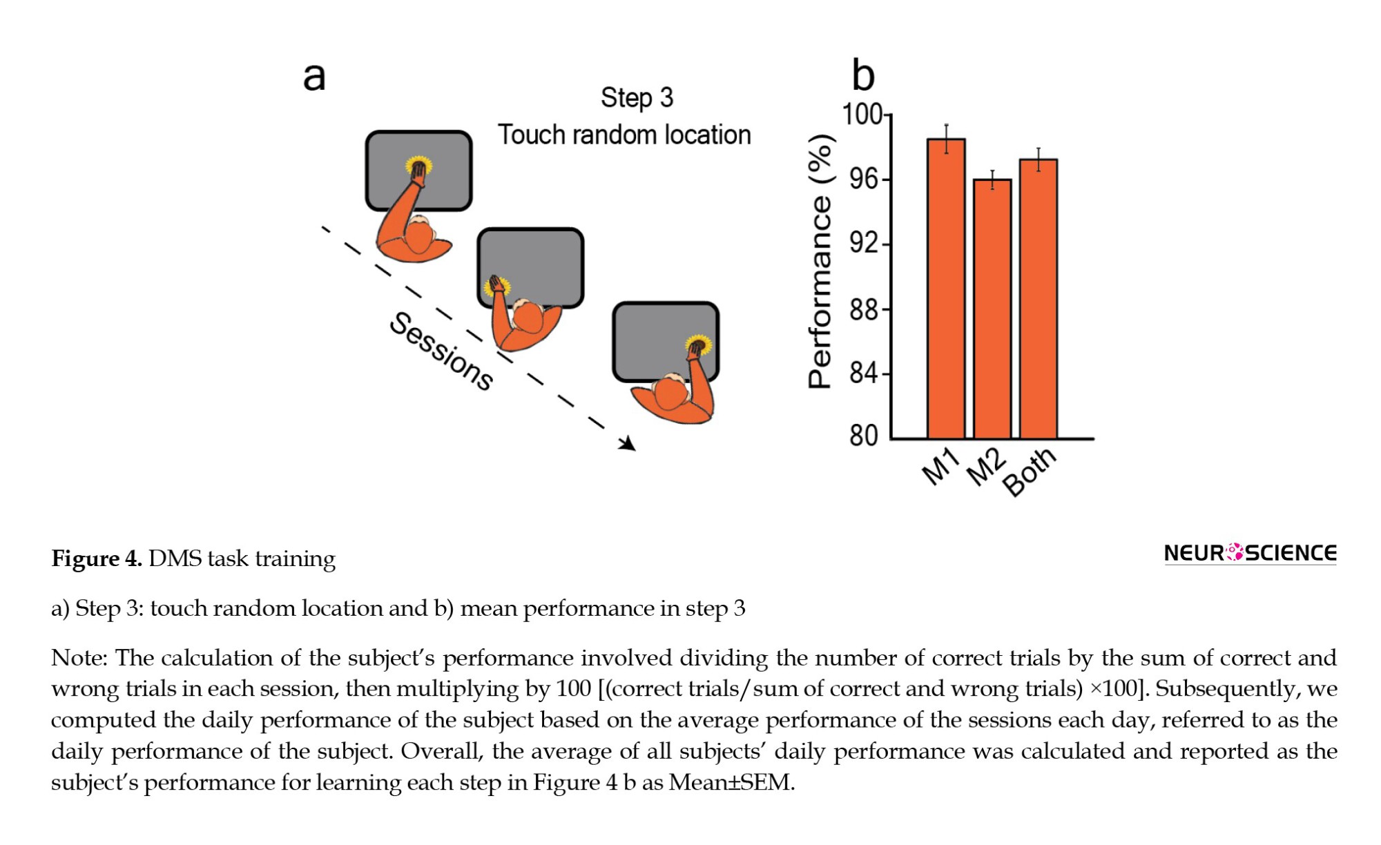 In the third step, our goal was to teach the animal to associate choosing images in various locations on the touchscreen with receiving a reward. Additionally, we wanted to ensure that the animal focused on the sample image rather than just the center of the screen. From this stage onward, the size of the stimuli was set to 192×192 pixels. To fulfill the objective of the third step, we presented stimuli randomly in 9 different locations on the screen. The monkey needed to touch only the location of the displayed stimulus accurately. If the monkey touched anywhere else on the screen, the trial was considered incorrect (Figure 4a). Monkeys completed this step in 12 sessions over 3 days. Monkey M1 had a mean performance of 97±2% on day 1, 98.5±1.4% on day 2, and 100% on day 3. For Monkey M2, the mean performance on day 1 was 95±1.6%, on day 2 was 96±0.9%, and on day 3 was 97±1.5%. Overall, the mean performance for all days reached 98.5±0.87% for Monkey M1, 96±0.5% for Monkey M2, and the combined average performance for both monkeys was 97.25±0.7% (Figure 4b).