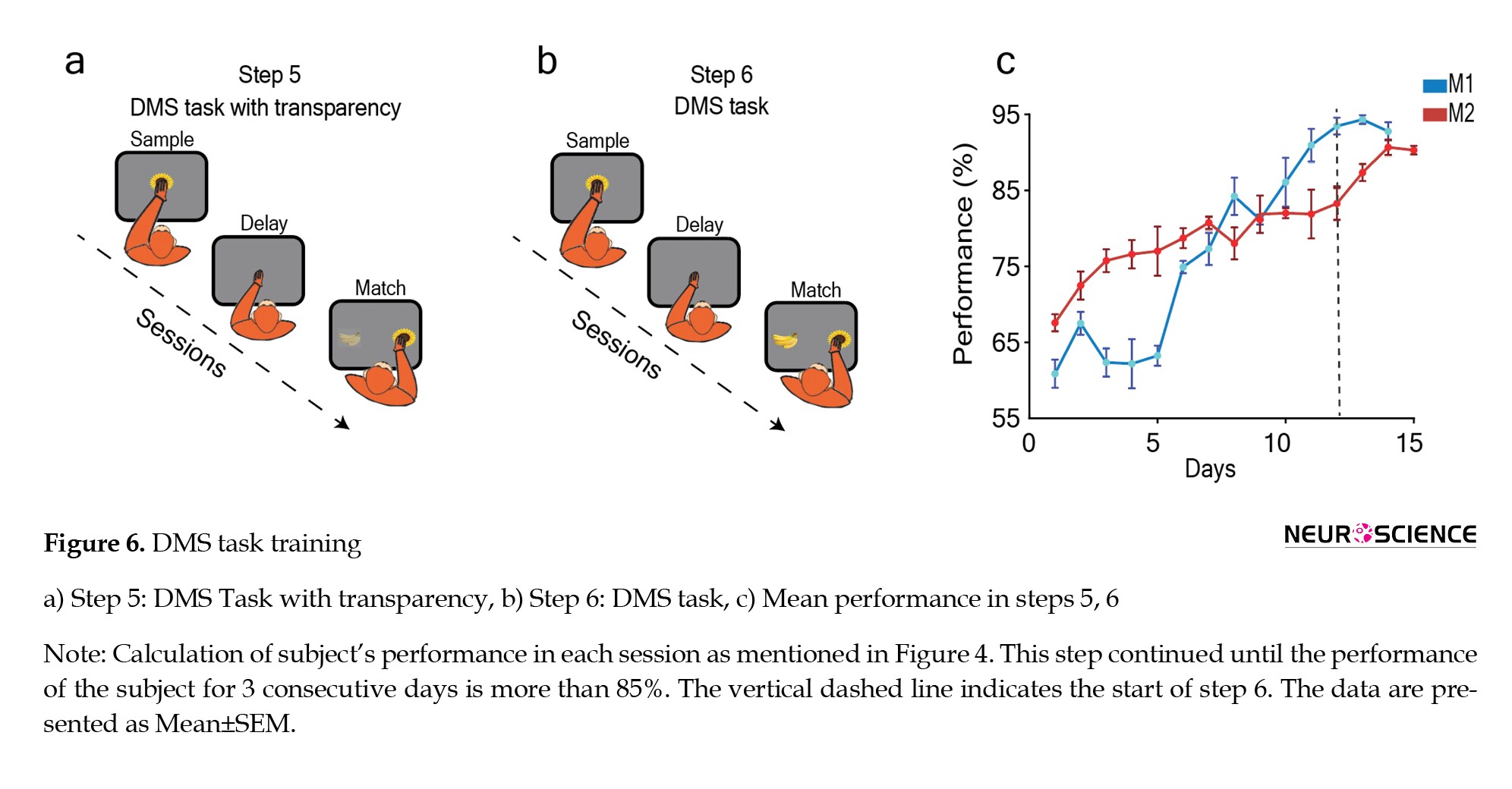 After familiarizing the animal with the device in earlier steps, our focus shifted to teaching the DMS task. The DMS task is a cognitive test used in psychology and neuroscience to assess working memory in animals, particularly primates. The task begins with the presentation of a sample stimulus (e.g. an image or object) to the subject. The subject is required to observe and remember this stimulus. After the sample presentation, there is a delay period during which no stimuli are presented. The length of this delay can vary, and it tests the subject’s ability to retain information over a short-term memory interval. Following the delay, the subject is presented with a set of stimuli, which includes the original sample (matching stimulus) and distractors (non-matching stimuli). The subject’s task is to select the stimulus that matches the one presented during the sample phase. A correct response occurs when the subject chooses the stimulus that matches the one from the sample phase. This indicates successful working memory retrieval.