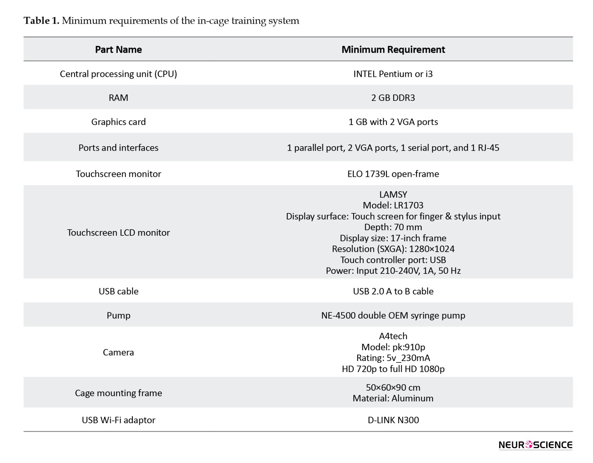 Listed are the various parts of the in-cage training system and the minimum requirement for each part (Table 1).