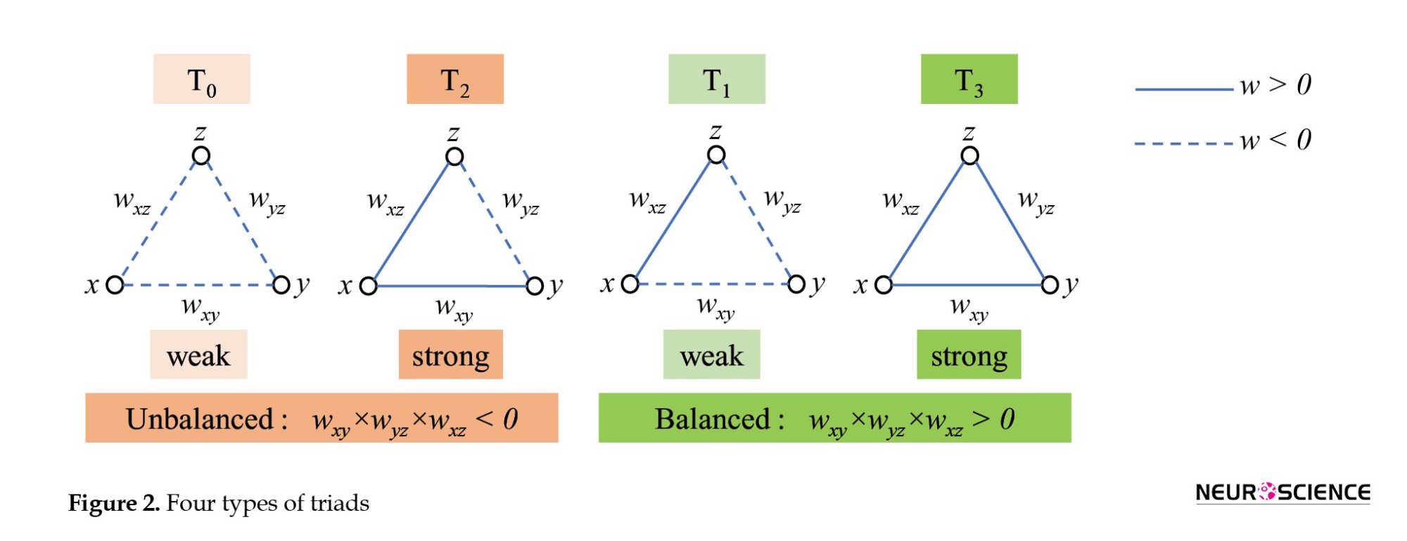 In this study, as with Moradimanesh and colleagues (Moradimanesh et al., 2021), four types of triads were analyzed in LFB, MFB, HFB, and FFB. These triads were strongly balanced T3: (+ + +), weakly balanced T1: (+ −−), strongly unbalanced T2: (+ + −), and weakly unbalanced T0: (−−−) (Figure 2).