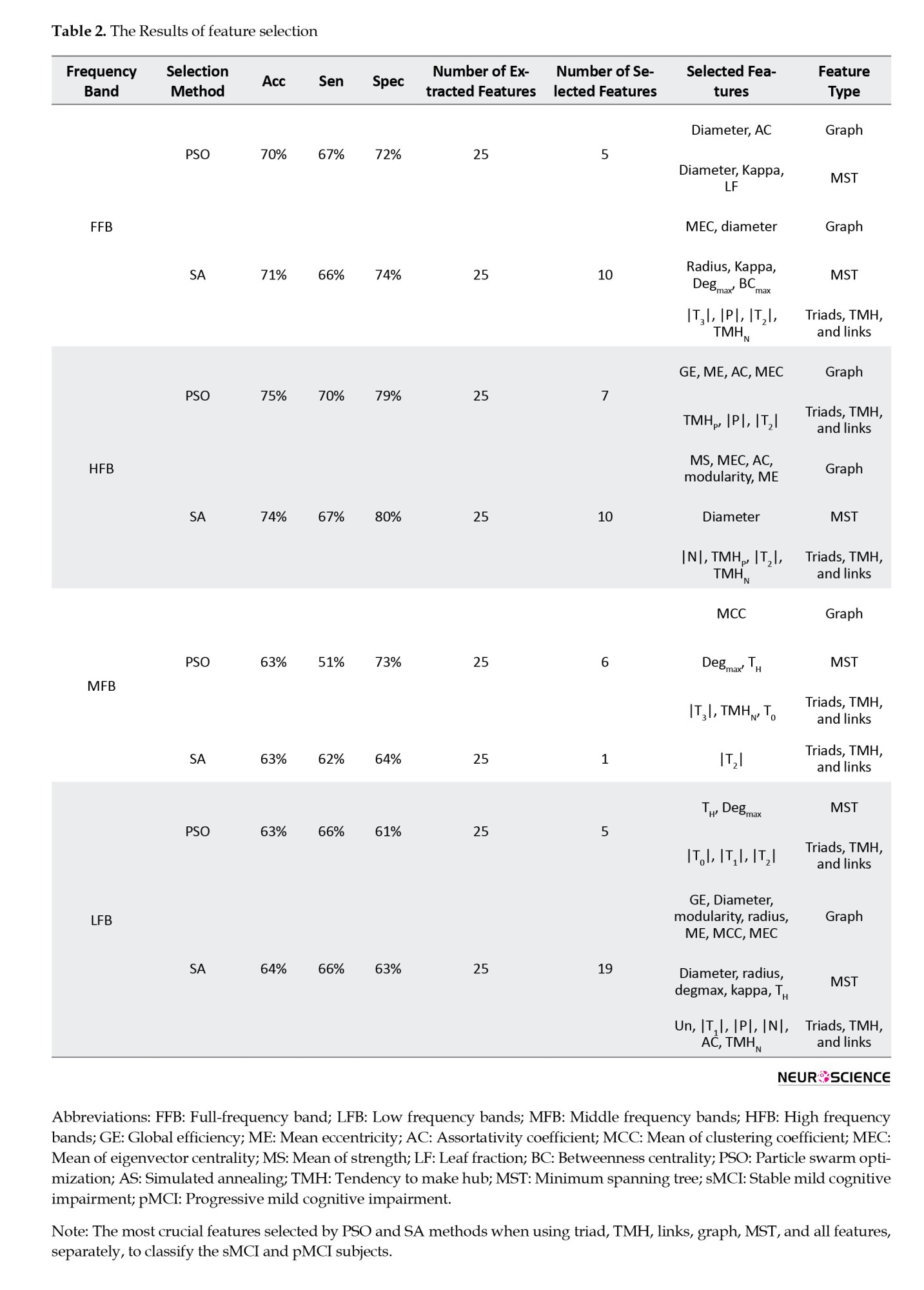 In the first approach, four feature sets were separately used to classify sMCI and pMCI. These groups were all features (100), graph features (36), MST features (28), and triads, TMH, and link features (36) (the number in parentheses indicates the number of features). In this approach, the effect of features over all frequency bands of the graph was studied. The frequency bands were FFB, LFB, MFB, and HFB. In the second approach, features extracted from FFB, LFB, MFB, and HFB were separately used for classification. This analysis could show which frequency bands offered the best and the worst features for classification. For each frequency band, all features of the graph, MST, Triads, TMH, and Links were employed (25 features in total). After feature selection and classification, the results shown in Tables 2 and 3 were obtained for the first and second approaches, respectively.