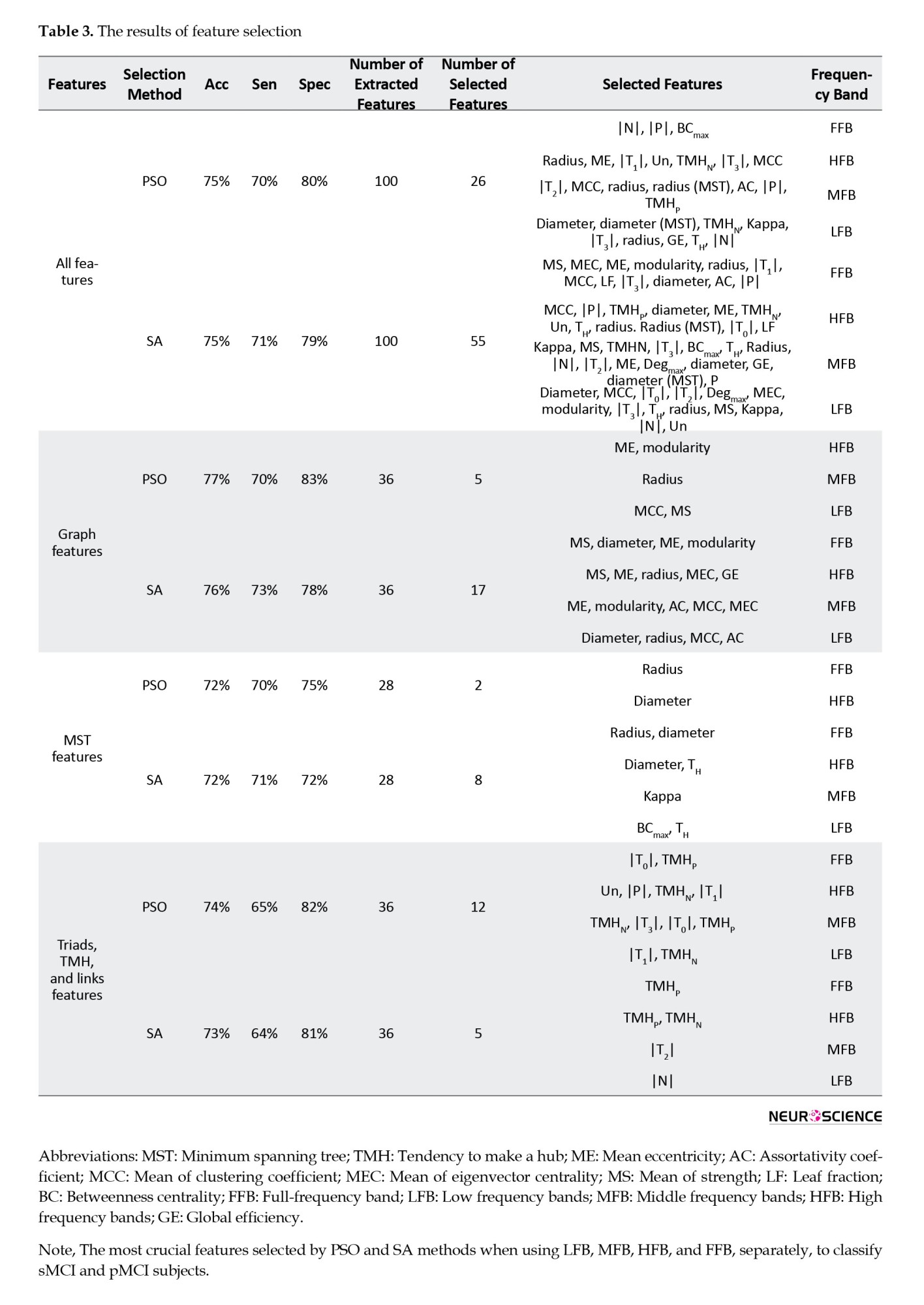 The feature selection process played a crucial role in enhancing classification accuracy. Both PSO and SA algorithms were employed to identify the most relevant features for distinguishing between sMCI and pMCI groups. The resulting feature subsets demonstrated distinct patterns depending on the algorithm used and the type of features considered.