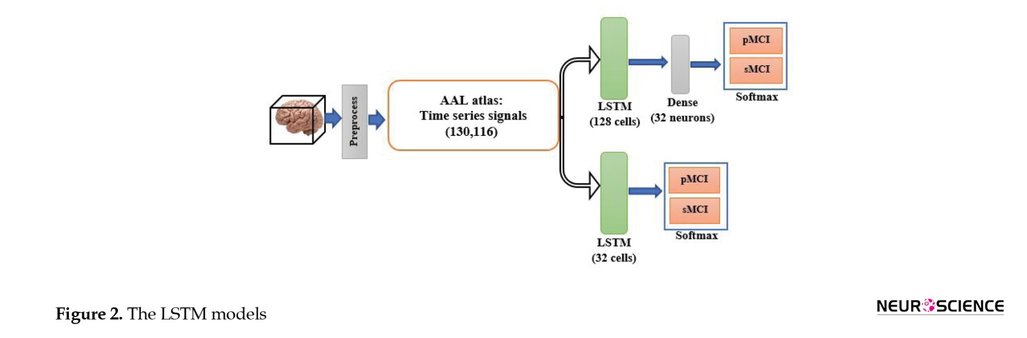 Functional MRI is a set of three-dimensional images recorded for a limited time. Therefore, CNN and LSTM models can be used to process the fMRI spatial and temporal aspects. To our knowledge, this is the first study to use DL methods for fMRI processing and to combine clinical information to predict MCI-to-AD conversion using the proposed method. First, we evaluated whether the temporal aspect alone provided sufficient discriminative information. Therefore, we used the automated anatomical atlas to define and divide the brain into 116 regions; thus, the LSTM network’s input was a 130-by-116 matrix (130 time points and 116 features). We designed two LSTM models with 32 and 128 cells to investigate the effect of the number of LSTM cells per layer on the model’s diagnostic performance. Since the output size of all models must have been the same and equal to 32, a fully connected layer with 32 neurons was added after the 128-cell layer. The outputs of both models were then fed into a dense layer with two neurons and a softmax activation function for classification. Figure 2 shows the LSTM model.