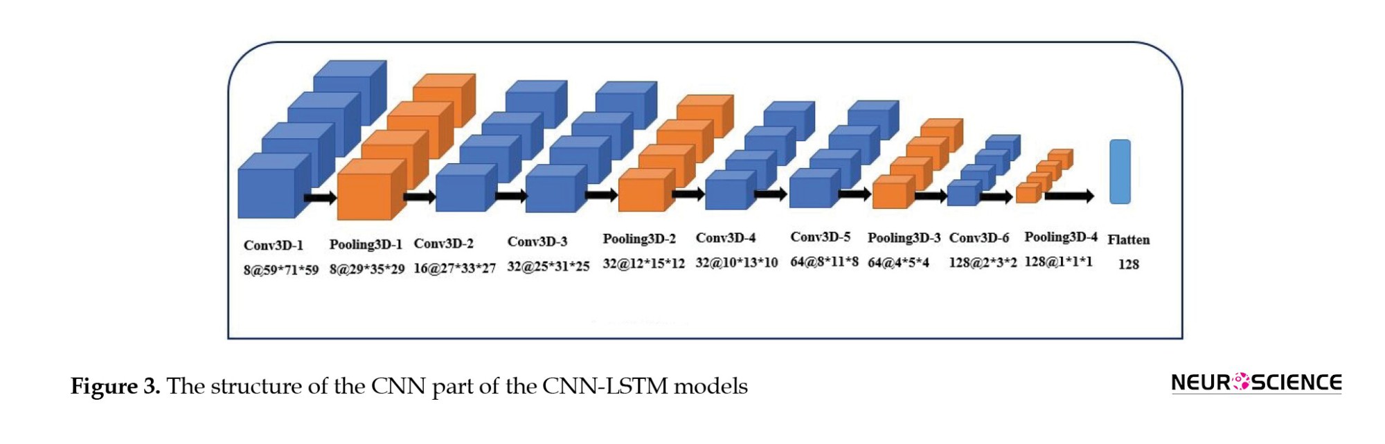 Second, when CNN and LSTM models are combined, the resulting model is called CNN-LSTM, composed of a CNN part to extract spatial features, followed by an LSTM layer to extract temporal information. Figure 3 illustrates the structure of the CNN part of the CNN-LSTM models. The convolutional part of our proposed model was three-dimensional to prevent initial information loss due to data transformation. It consisted of six convolutional layers, with a filter size of 3×3 and a stride of one, and four max-pooling layers with a filter size of 2×2 and a stride of two. The input of this network was single functional images (regardless of the time dimension). The output of the last layer was 128 extracted features. Since 130 images were available for each sample, we utilized 130 3D-CNN models, each analyzing images from a specific time point, and concatenated their outputs to feed an LSTM layer (Figure 4). We designed two CNN-LSTM models since we previously designed two LSTM models.