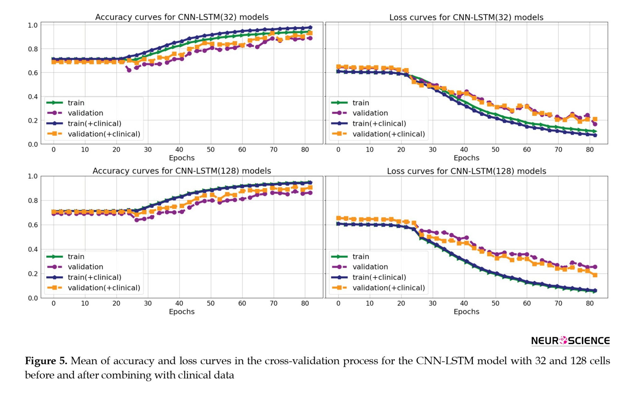 Figure 5 shows the mean accuracy and loss curves in the 5-fold CV training procedure of the CNN-LSTM models for the training and validation sets in four models (CNN-LSTM models with 32 and 128 cells and before and after combining with the clinical data). The models were trained for approximately 80 iterations. We optimized the model architecture and hyperparameters by trial and error, examining learning progress based on validation and training metrics to avoid overfitting.