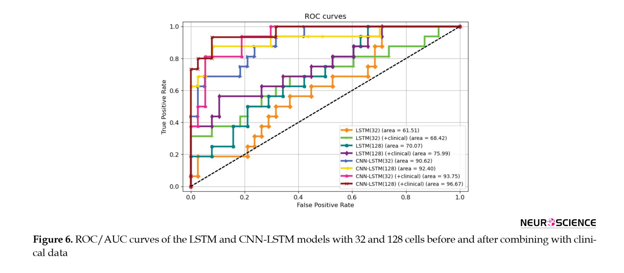 Figure 6 shows the ROC and AUC diagrams of the LSTM and CNN-LSTM models with 32 and 128 cells before and after combining with clinical data.