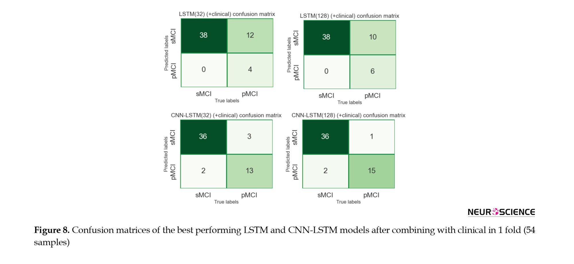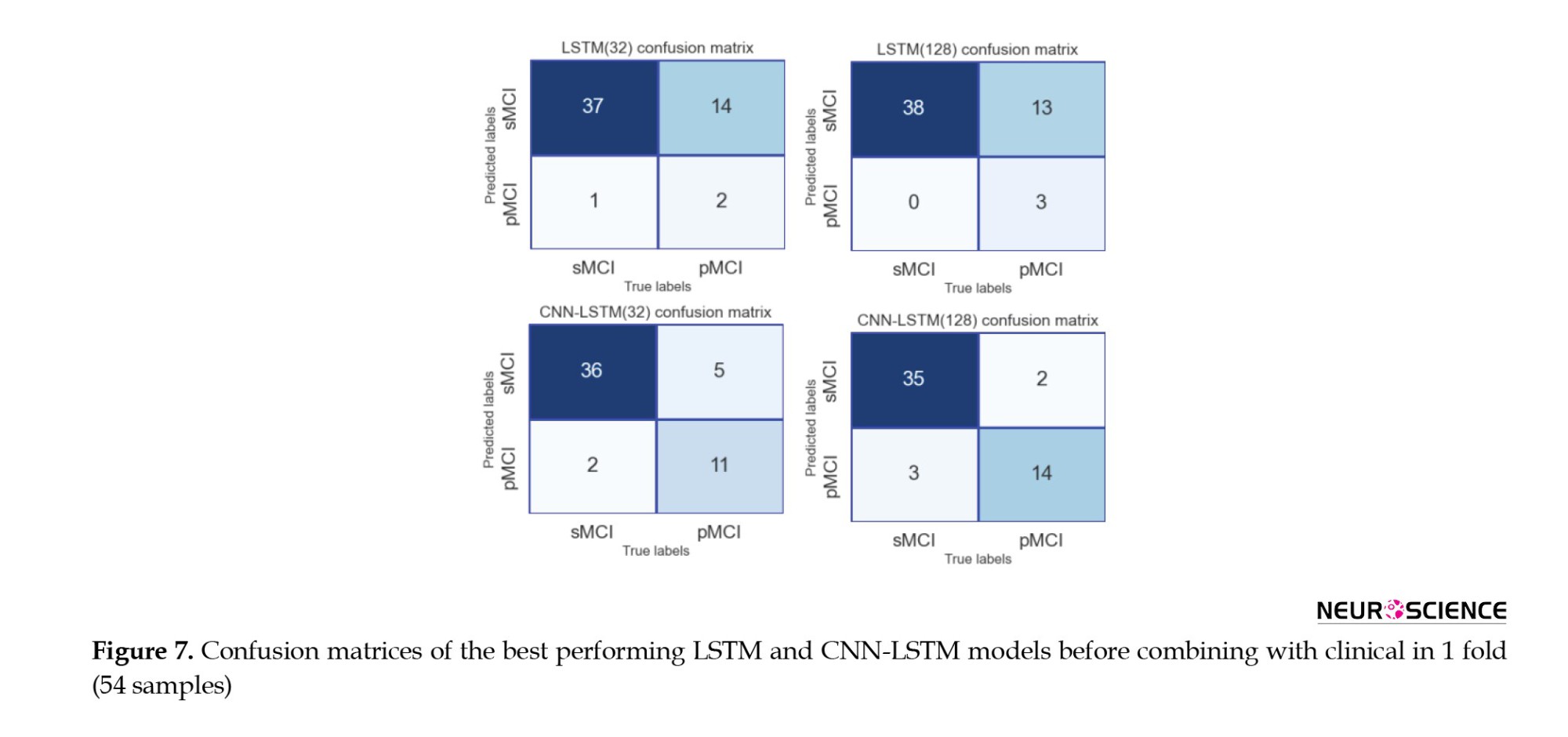 The 128-cell CNN-LSTM model, combining fMRI and clinical data, demonstrated the best results. Also, it is shown and concluded that the combination with the clinical predictors made the models more sensitive to the pMCI class since the curves started from points with higher true-positive rates. Finally, Figures 7 and 8 show confusion metrics of the best-performing LSTM and CNN-LSTM models (before adding clinical information) and (after adding clinical information).