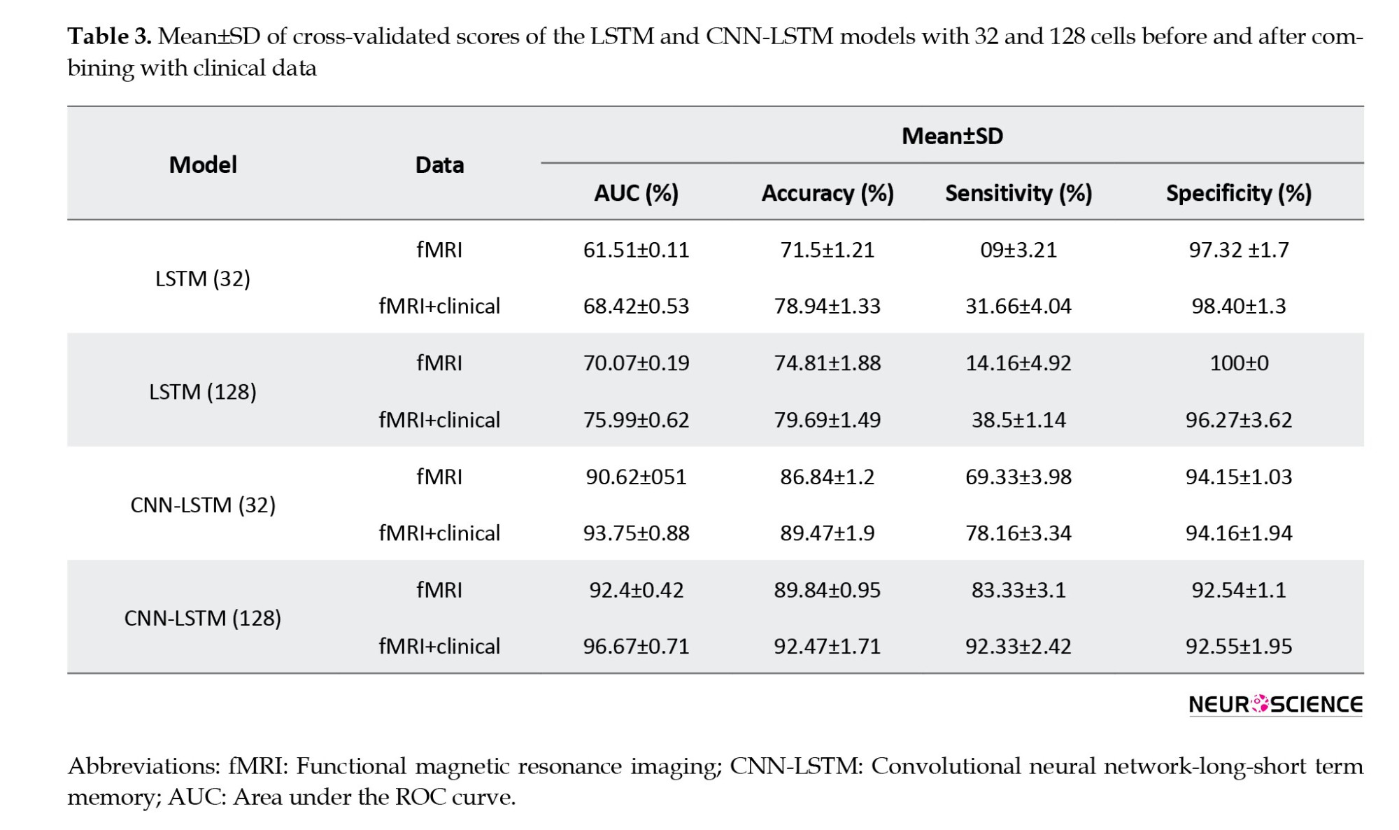 The Mean±SD values of accuracy, sensitivity, specificity, and AUC metrics for the five test subsets are reported for eight models (LSTM models with 32 and 128 cells, CNN-LSTM networks with 32 and 128 cells, before and after combining with clinical data) in Table 3.
