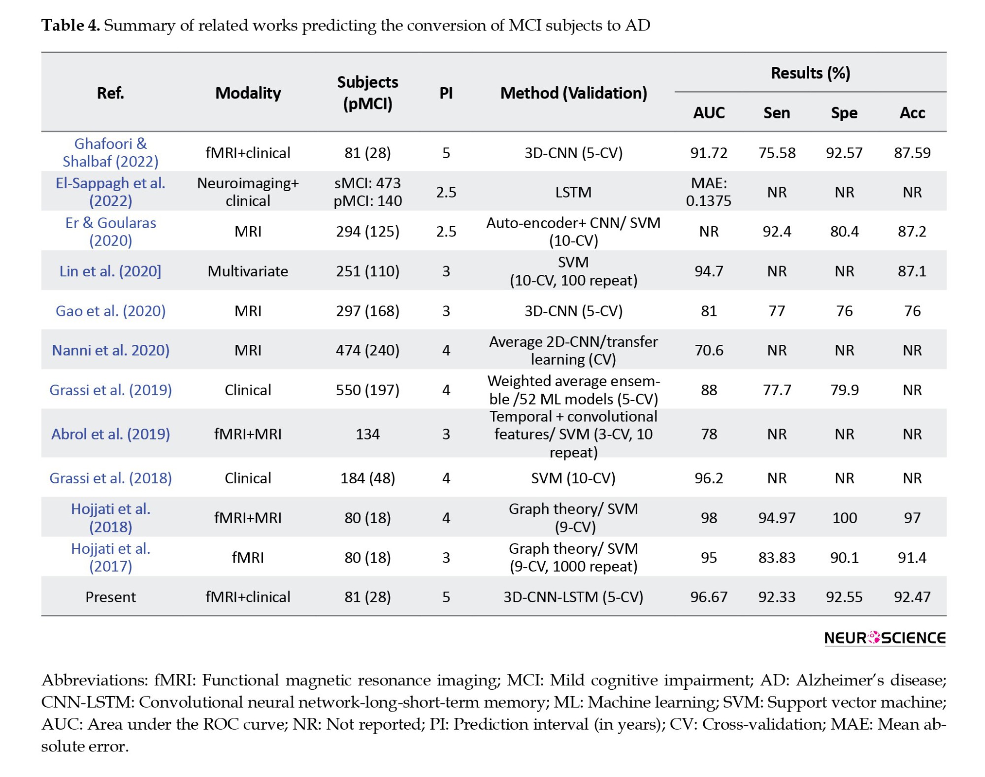 Many studies have attempted to solve the problem of predicting AD among patients with MCI. Even though some studies provided machine learning techniques with a good level of accuracy, the data used by their algorithms was a combination of invasive data, which makes the proposed methods less applicable in real life. Table 4 summarizes the articles that predicted conversion from MCI to AD. As mentioned in this table and in a review of studies using neuroimaging biomarkers for AD prediction (Valizadeh et al., 2025; Zarei et al., 2025), MRI, fMRI, and PET are the most commonly used modalities.