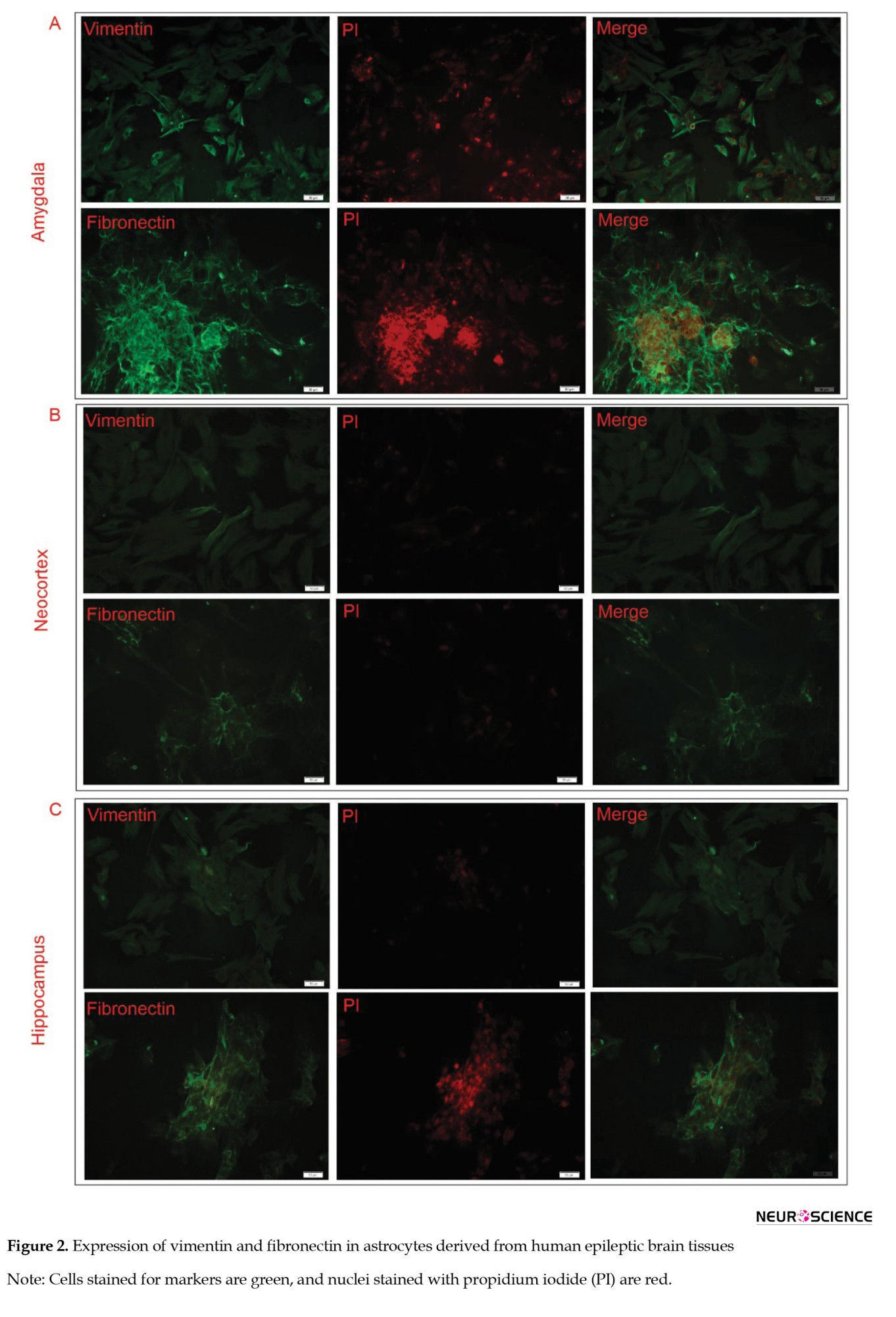 We performed immunocytochemistry to characterize cells. Initially, we discarded the culture medium and rinsed the cells with PBS. Next, we treated the cells with 4% paraformaldehyde for 30 min to fix them. Following that, we permeabilized the cells using a Triton X-100 solution and applied normal goat serum and BSA as blocking agents. We then applied primary antibodies, such as GFAP (Sigma, Germany) at a 1:200 dilution, vimentin (Santa Cruz, Germany) at a 1:100 dilution, and Fibronectin (Merck, Germany) at a 1:100 dilution, as markers for astrocytic cells at 4 °C. After this, we applied secondary antibodies, including goat anti-mouse fluorescein isothiocyanate (Abcam, UK), for 1.5 h at room temperature. We used propidium iodide to stain cell nuclei and incubated secondary antibodies alone to identify negative controls. Finally, we examined the data using fluorescent microscopy (Olympus, Germany). The tissue derived from patient number 1 for the amygdala, number 7 for the neocortex, and number 4 for the hippocampus was used for cell characterization.