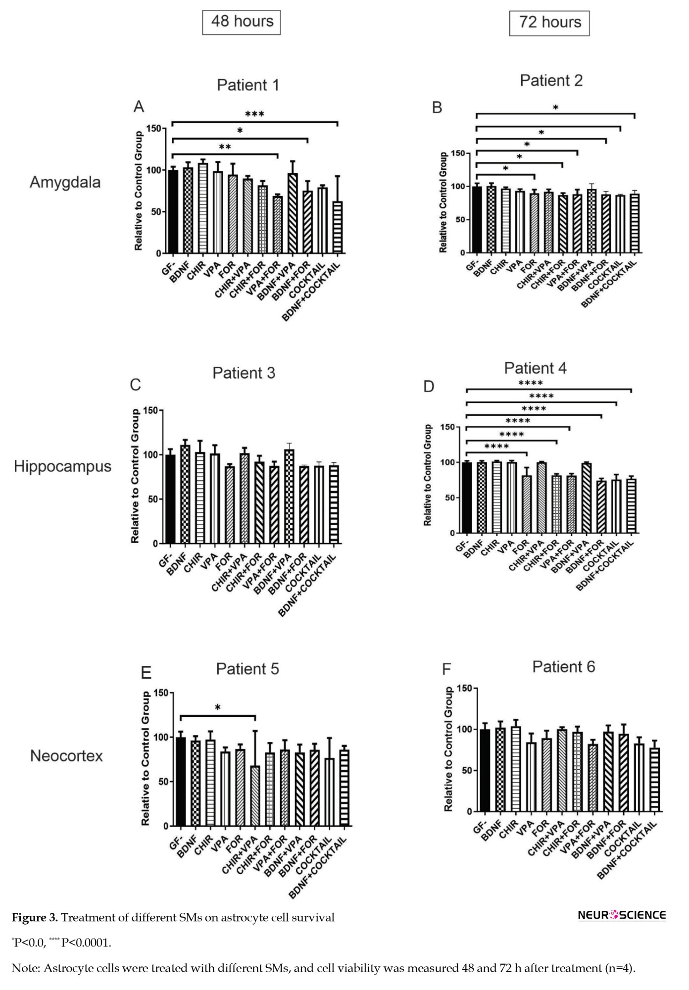Astroglial cells make up around 30% of all cells in the adult mammalian central nervous system, making them the most prevalent cell type (Liddelow & Barres, 2017). These cells share early progenitor cells with neurons. They are highly likely to be converted into neurons in neurological disorders, where there is neuronal loss or a high number of astrocytes due to uncontrolled proliferation. Thus, inhibiting astrocyte proliferation, mainly astrogliosis, occurs in epilepsy and creates a chaotic environment; targeting the proliferation and viability of astrocytes could be a novel approach to managing MTLE (Chandrasekaran et al., 2016; Westergard & Rothstein, 2020). The present study demonstrates that specific SMs can reduce the viability of astrocytes in some epileptic patients. To arrive at a valid conclusion, we conducted viability assays on astrocytes isolated from different tissues (amygdala, hippocampus, and cortex) obtained from intractable epileptic patients individually. Notably, tissue heterogeneity, brain localization, and the timing of epilepsy onset and seizure duration may influence the cellular response to our intervention (Wong, 2019). However, the results of two studies have indicated that the differentiation of astrocytes derived from human fetal brain tissue and cell lines was taken into neurons (exposed to TTNPB, SB431542, LDN193189, Thiazovivin, CHIR99021, DAPT, VPA, SAG, purmophamine) and oligodendrocytes (exposed to CHIR99021, Forskolin, Repsox, LDN, VPA, and Thiazovivin), respectively, when exposed to SMs (Sharifi-Kelishadi et al., 2024; Zhang et al., 2015). This means SMs can regulate astrocyte molecular mechanisms. The difference between this study and our findings was that we used several tissues, while these two studies assessed their response on one cell type or cell line. The heterogeneity of cells was evident in our study; this might affect the response to SMs. Another difference was that the outcome of our study was viability for a maximum of 72 h, while those studies evaluated differentiation during 10 days. Additionally, we just used three SMs, while they used 9 SMs for neuronal differentiation and 6 SMs for oligodendrogenesis.