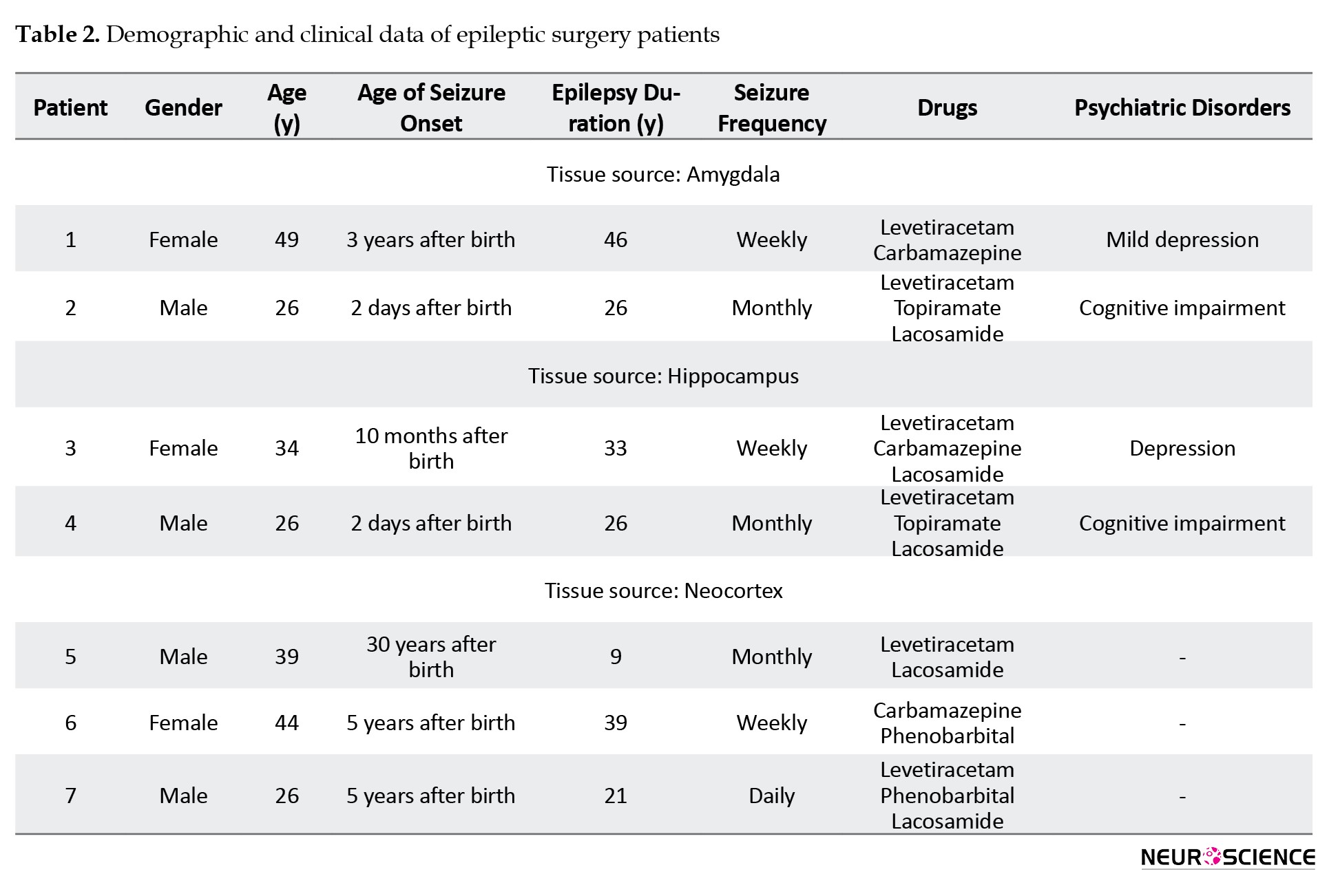 Tissues from temporal lobe resections were collected from seven patients with drug-resistant temporal lobe epilepsy who underwent surgery at Khatam Alanbia Hospital in Tehran and Imam Reza Hospital in Mashhad City, Iran.