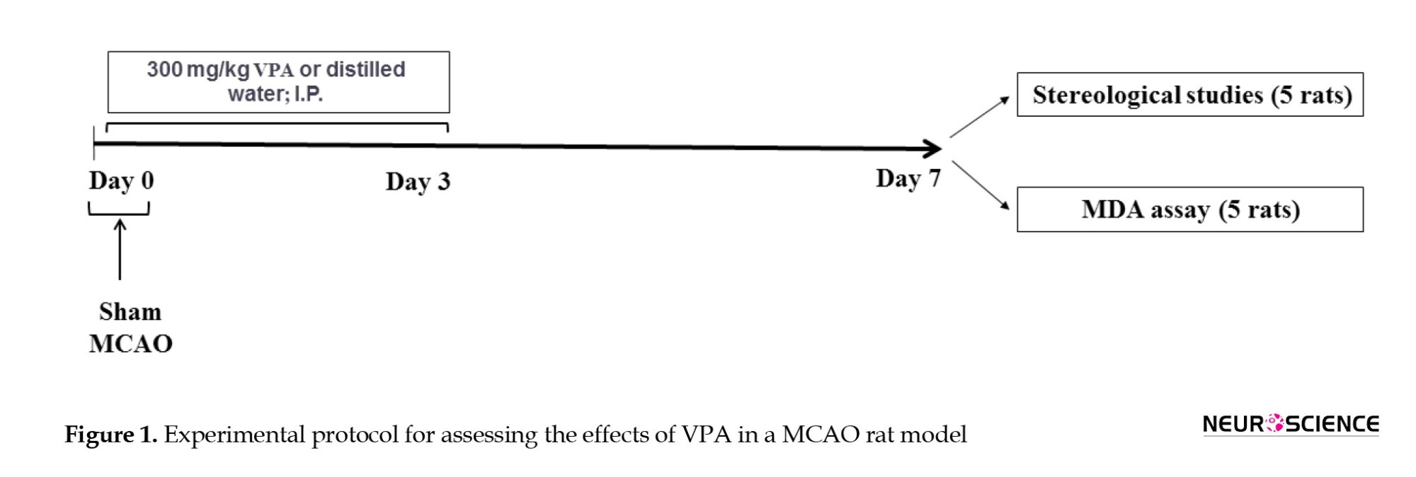 The MCAO model was established as described in our previous studies (Naseh et al., 2022; Naseh et al., 2020). Briefly, the rats were anesthetized with intraperitoneal (IP) injection of ketamine (60 mg/kg) and xylazine (10 mg/kg). Then, the right common carotid and external carotid arteries (ECA) were exposed. A silicone-coated monofilament suture (4043PK5Re, Doccol, USA) was introduced to the external carotid artery (ECA) and advanced through the internal carotid artery (ICA) to occlude the middle cerebral artery (MCA) for an hour. The suture was subsequently removed, allowing reperfusion. Notably, the body temperature of rats was controlled by a rectal thermometer. Sham surgery was performed similar to the MCAO protocol except without inserting a monofilament into the ICA. VPA (300 mg/kg (Mann Brukner et al., 2018; Naseh et al., 2022; Xuan et al., 2012); Merck, Germany) was solubilized in 300 μL distilled water, and injected IP on days 0, 1, 2, and 3 post-MCAO (Figure 1). Intraperitoneal administration was chosen to ensure accurate dosing and to avoid the stress associated with oral gavage.