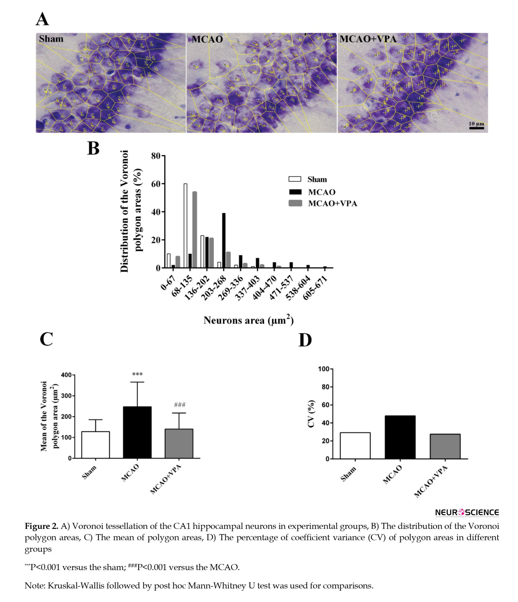 The mean Voronoi polygon area increased significantly in the MCAO group compared to the sham group (P<0.001). Although, VPA significantly decreased this parameter (P<0.001) (Figures 2A and 2C).