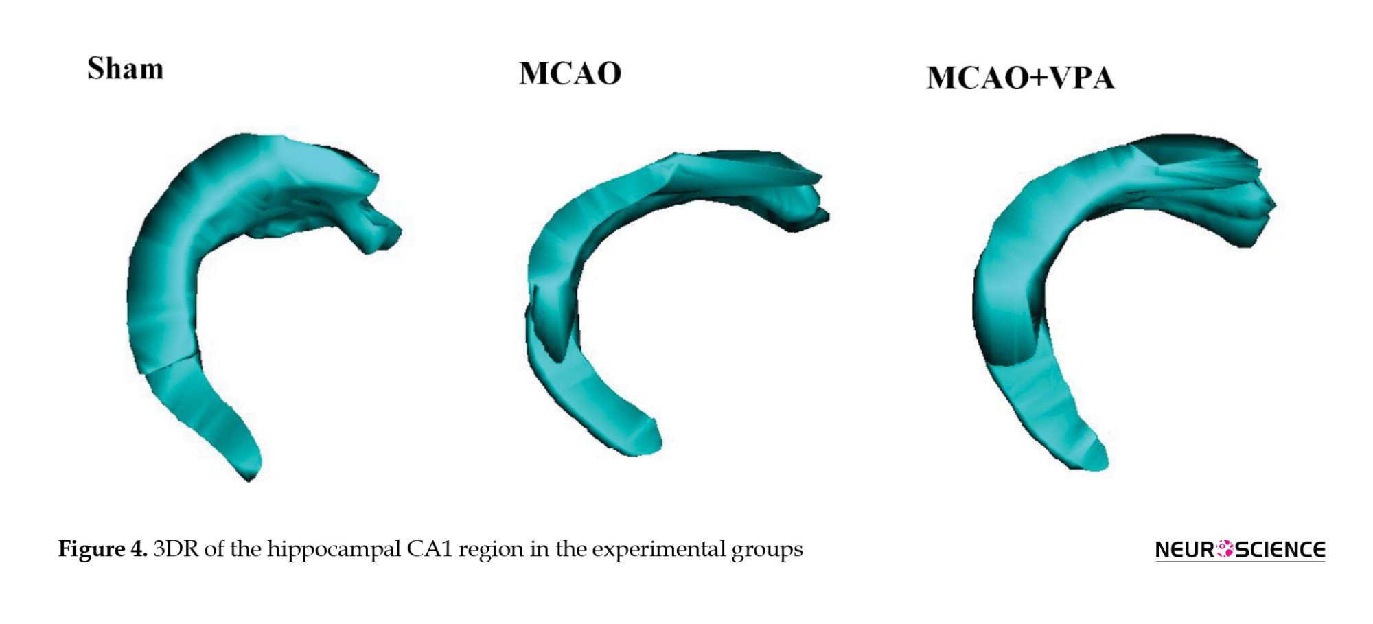 Figure 4 shows the 3DR of the CA1 hippocampal region. The structure of CA1 in the MCAO group showed significant deformation compared to the sham group. However, the shape of CA1 in the MCAO + VPA group remained within the normal range and was close to that of sham group.
