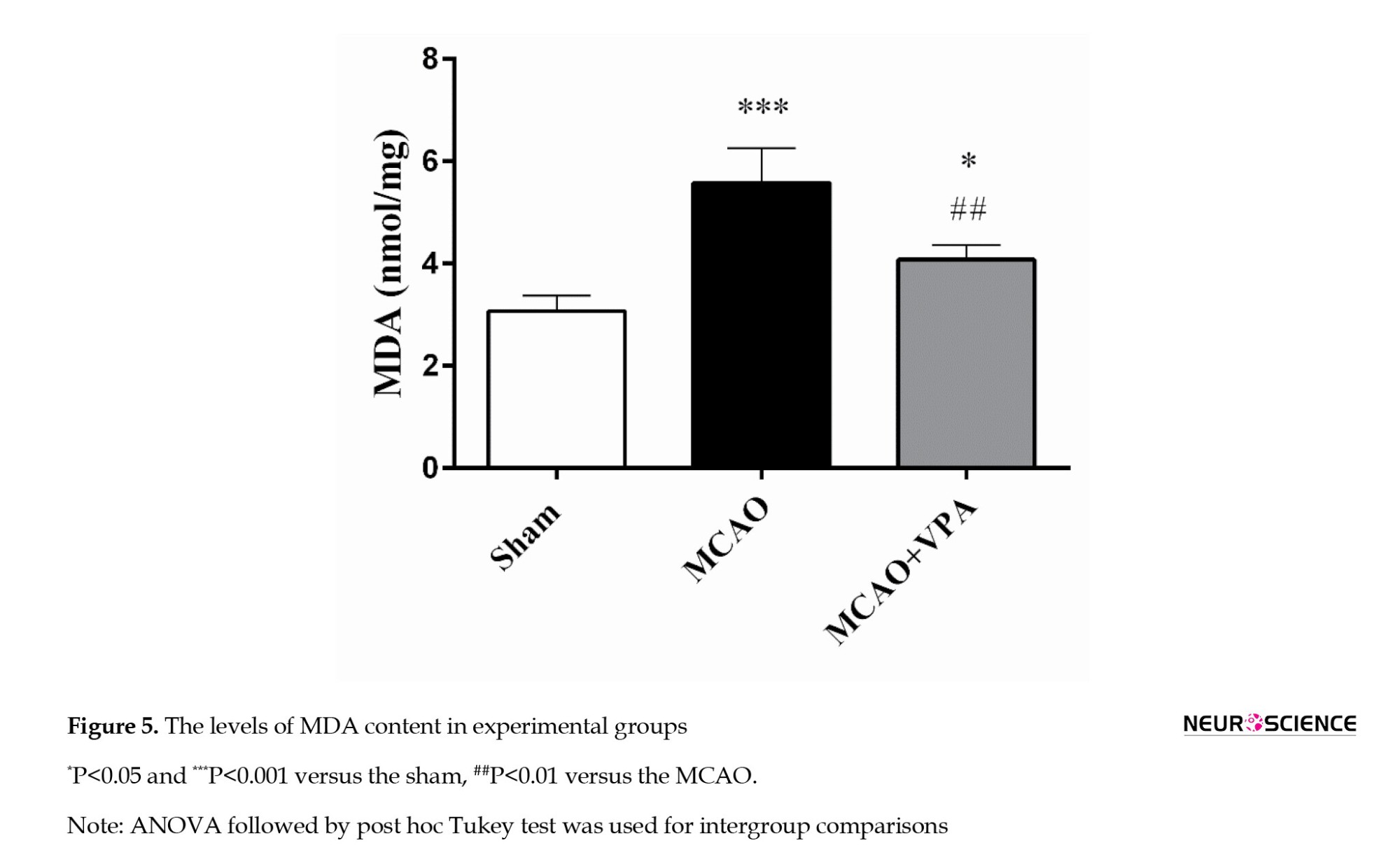 The MDA levels were significantly elevated in the MCAO and MCAO + VPA groups compared to those in the sham group (P<0.001 and P<0.05, respectively). Notably, VPA treatment significantly reduced this parameter in the MCAO + VPA group compared to the MCAO group (P<0.01) (Figure 5).