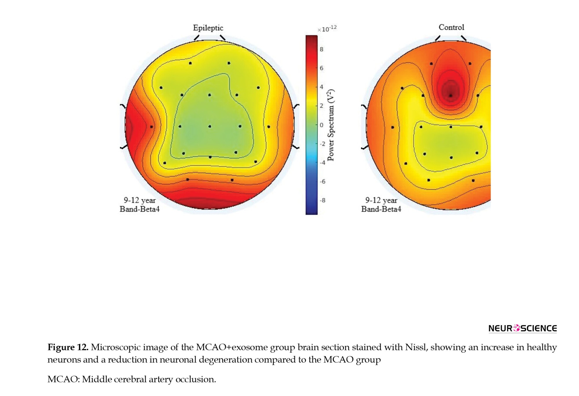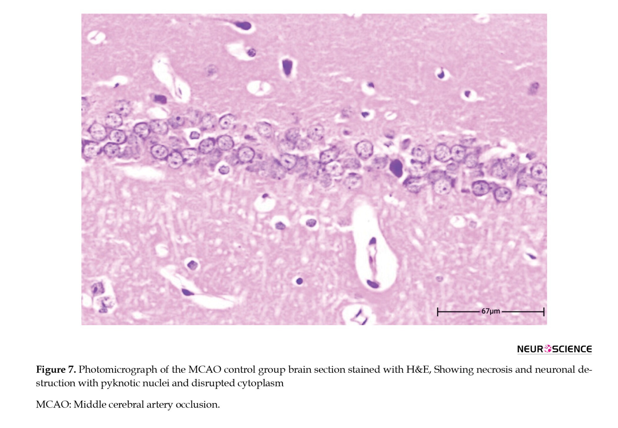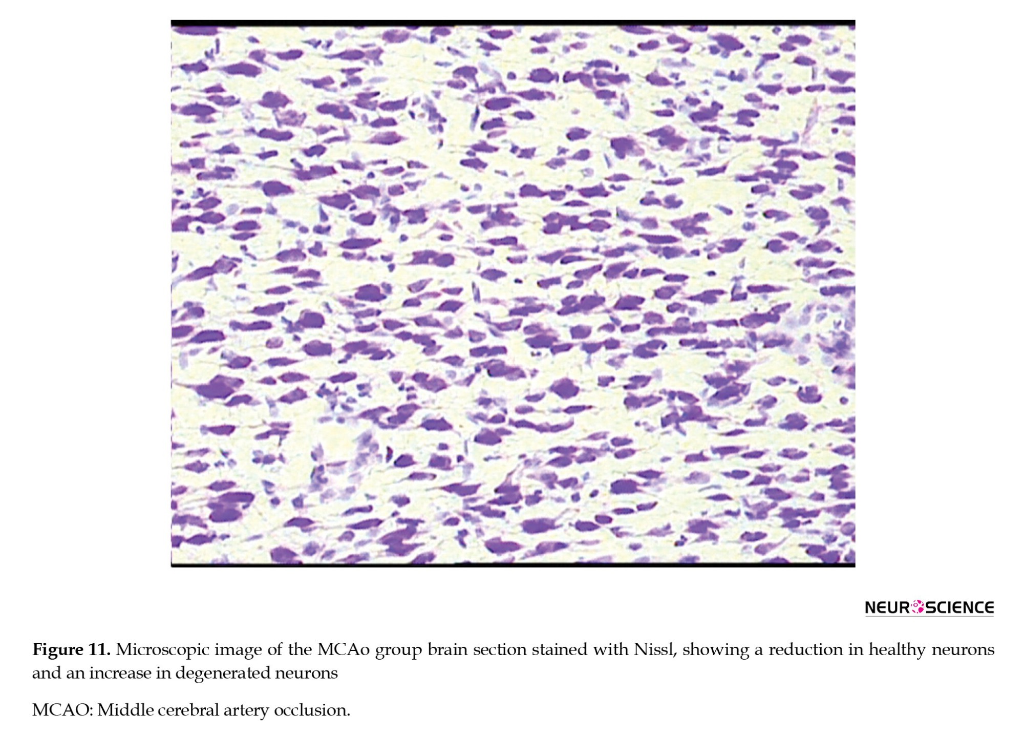● In the MCAO control group, a significant reduction in the number of healthy neurons was observed. Many neurons had shrunken and pyknotic nuclei, and basophilic material accumulated in the cytoplasm of degenerated neurons. These degenerative changes indicated severe damage caused by ischemia (Figure 11).