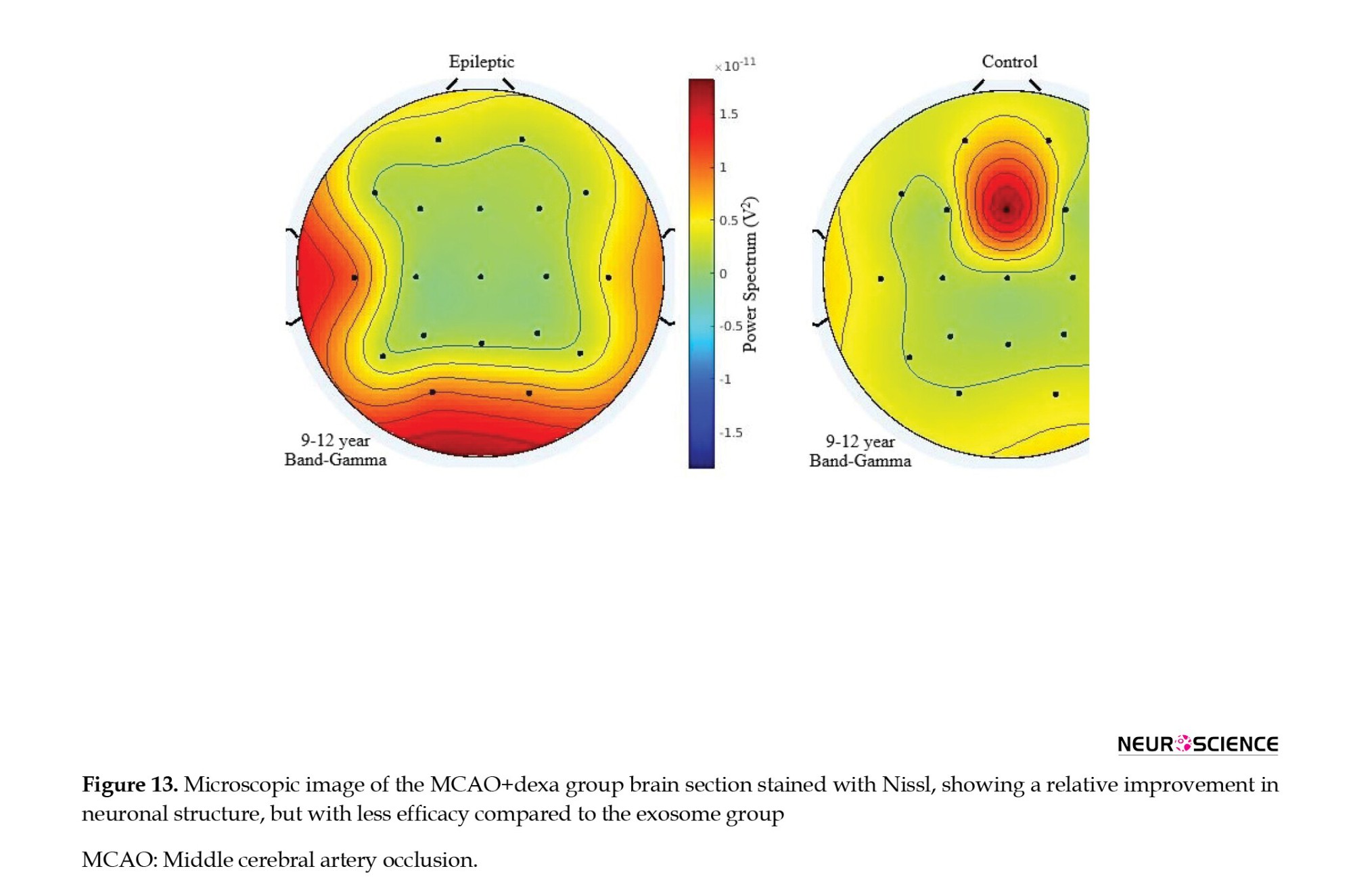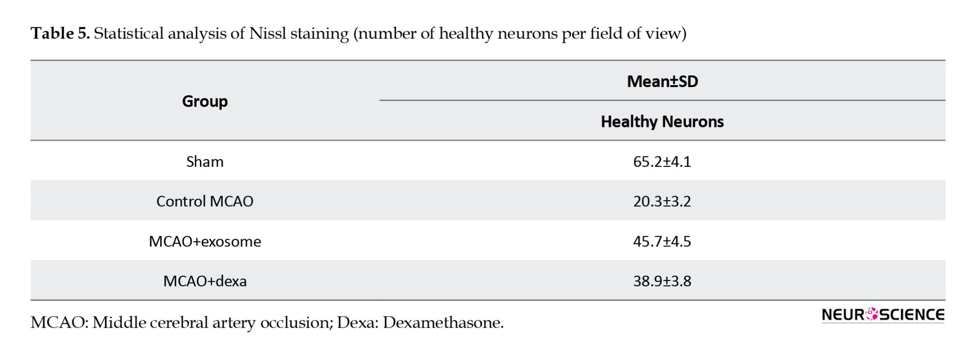● In the dexamethasone treatment group, an increase in the number of healthy neurons was observed compared to the MCAO group; however, the improvement was less pronounced than that in the exosome group (Table 5). Some neurons still exhibited signs of degeneration and reduced Nissl substance, but the severity of these changes was less than in the MCAO group (Figure 13).