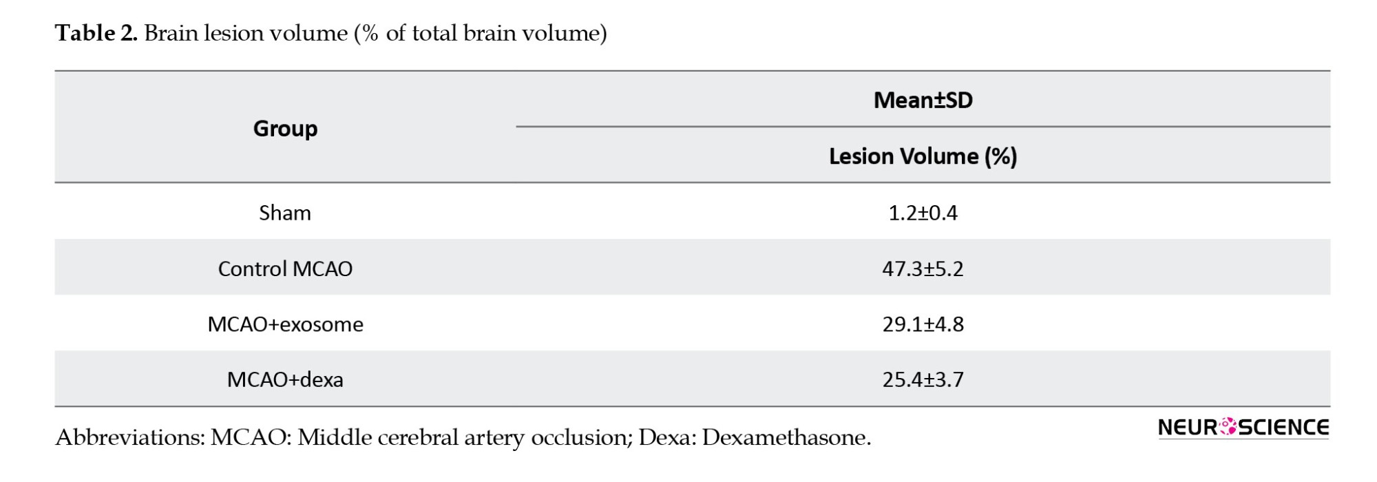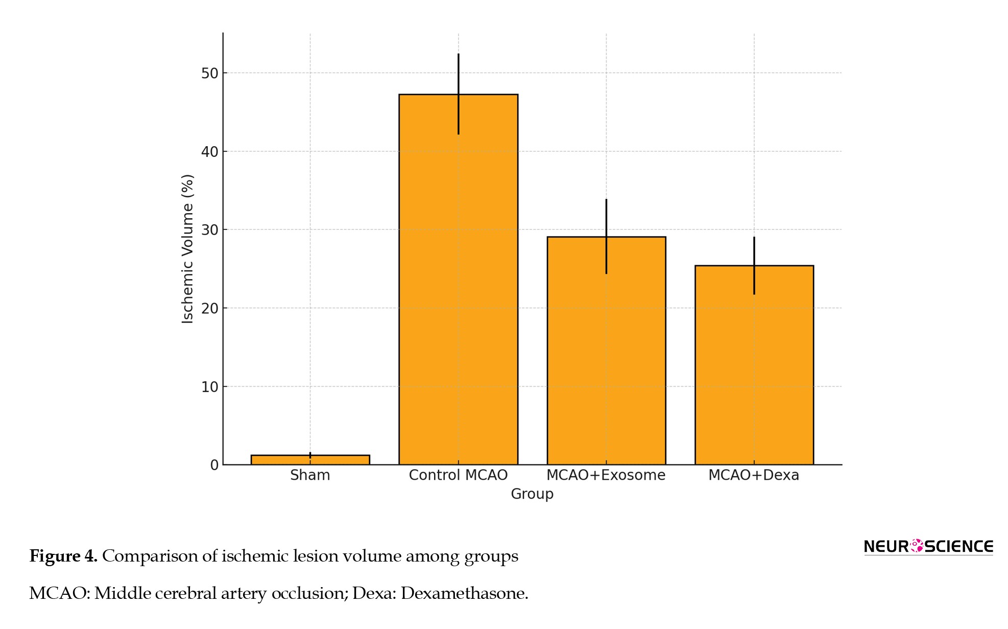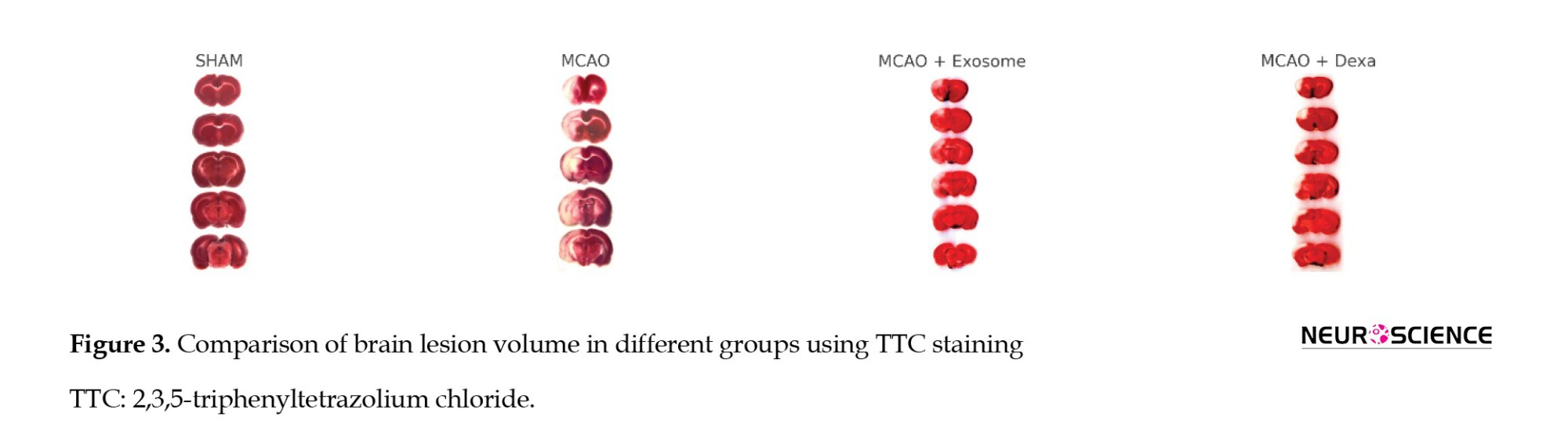 ● In the treatment groups (e.g. exosome and dexamethasone groups), infarct areas were significantly reduced compared to the MCAO group (Figure 4).