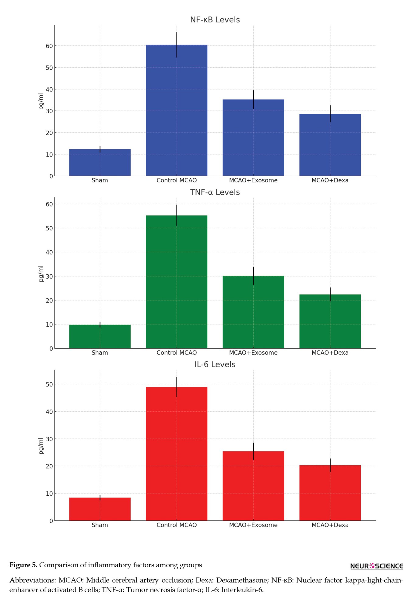 The inflammatory response plays a critical role in the pathophysiology of ischemic brain injury. This section examines the levels of key inflammatory markers (NF-κB, TNF-α, IL-6) in the serum of animals from different treatment groups. These factors are often elevated in response to ischemic injury and are associated with neuronal damage and neuroinflammation. The analysis of these factors helps in understanding the anti-inflammatory effects of the exosome and dexamethasone treatments (Figure 5, Table 3).
