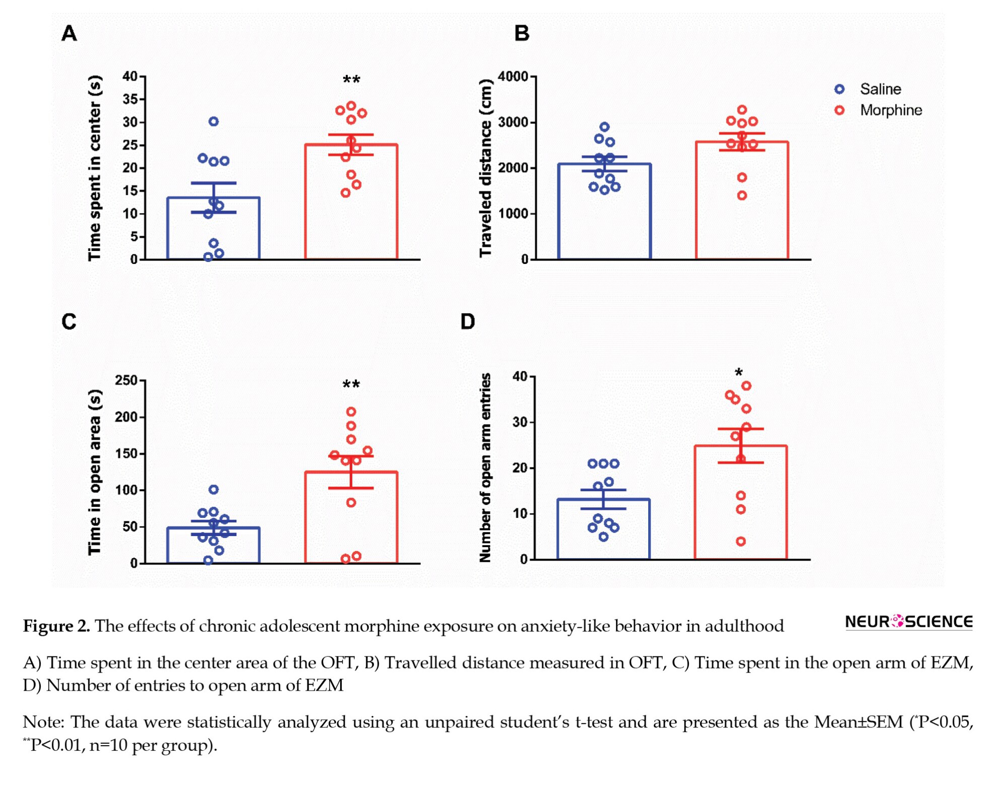 Epidemiological studies have shown a strong relationship between opioid use disorders and the later development of mood disorders (Grant et al., 2004; Kessler et al., 2003; Kessler et al., 2005; Regier et al., 1990). We previously observed that chronic morphine exposure during adolescence reduces anxiety-like behavior in adulthood, as assessed using the open field and elevated plus maze (Khani et al., 2022). In the present study, we utilized the elevated zero maze (EZM), which offers methodological advantages over the traditional elevated plus maze by removing the ambiguous central zone and allowing continuous exploration, to more accurately assess anxiety-related behavior.
