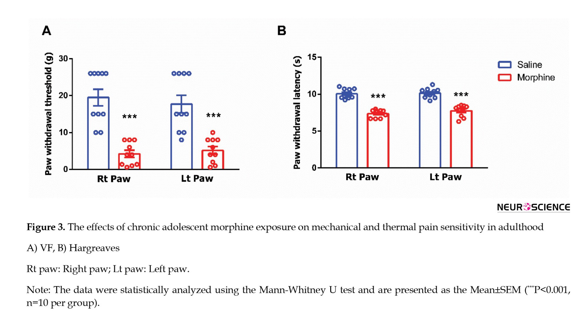 Next, we assessed mechanical allodynia, defined as abnormal sensitivity to non-noxious mechanical stimuli, and thermal hyperalgesia, characterized by an intensified response to noxious thermal stimuli, on PNDs 62 and 63 (Figure 1). Mechanical allodynia was evaluated using the VF filament test. Adolescent rats exposed to morphine exhibited a significantly reduced threshold for tactile sensitivity in both hind paws compared to saline-treated controls (right paw: Mann-Whitney U=0, P<0.0001; left paw: Mann-Whitney U=3.5, P=0.0001; Figure 3A). Thermal nociception was assessed using the Hargreaves test to determine the effects of morphine exposure during adolescence. Morphine-treated rats demonstrated significantly decreased paw withdrawal latencies in both hind paws relative to the saline group, indicating heightened thermal sensitivity (right paw: Mann-Whitney U=0, P<0.0001; left paw: Mann-Whitney U=0, P<0.0001; Figure 3B).
