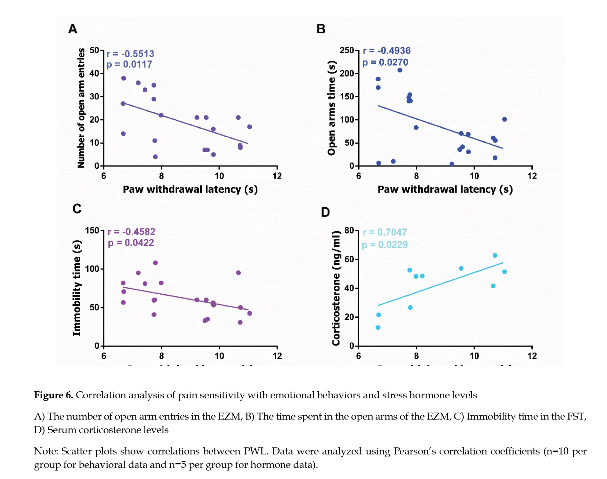 To investigate the relationship between nociceptive sensitivity and stress-related phenotypes, we conducted correlation analyses between PWL and multiple behavioral and hormonal stress markers. Specifically, we examined the associations between PWL and the following variables: The number of entries into the open arms of the EZM, the duration spent in the open arms of the EZM, serum corticosterone concentrations, and immobility time in the FST. These analyses aimed to determine whether altered pain sensitivity is associated with anxiety-like behavior, HPA axis regulation, and behavioral despair.